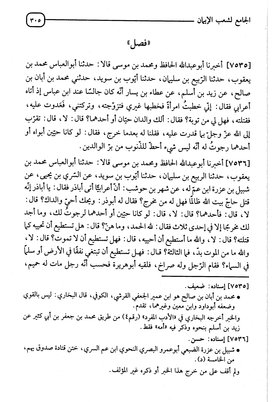 7535 - أَخْبَرَنَا أَبُو عَبْدِ اللهِ الْحَافِظُ، وَمُحَمَّدُ بْنُ مُوسَى، قَالَا: نا أَبُو الْعَبَّاسِ مُحَمَّدُ بْنُ يَعْقُوبَ، نا الرَّبِيعُ بْنُ سُلَيْمَانَ، نا أَيُّوبُ بنُ سُوَيْدٍ، حَدَّثَنِي مُحَمَّدُ بْنُ أَبَانَ بْنِ صَالِحٍ، عَنْ زَيْدِ بْنِ أَسْلَمَ، عَنْ عَطَاءِ بْنِ يَسَارٍ، أَنَّهُ كَانَ جَالِسًا عِنْدَ ابْنِ عَبَّاسٍ، إِذْ أَتَاهُ أَعْرَابِيٌّ فَقَالَ: إِنِّي خَطَبْتُ امْرَأَةً، فَخَطَبَهَا غَيْرِي، فَتَزَوَّجَتْهُ وَتَرَكْتَنِي، فَغَدَوْتُ عَلَيْهِ فَقَتَلْتُهُ، فَهَلْ لِي مِنْ تَوْبَةٍ؟ فَقَالَ: " أَلَكَ وَالِدَانِ حَيَّانِ أَوْ أَحَدُهُمَا؟ " قَالَ: لَا، قَالَ: " تَقَرَّبْ إِلَى اللهِ عَزَّ وَجَلَّ بِمَا قَدَرْتَ عَلَيْهِ "، فَقُلْنَا لَهُ بَعْدَ مَا خَرَجَ، فَقَالَ: " لَوْ كَانَ حَيَّيْنِ أَبَوَاهُ أَوْ أَحَدُهُمَا رَجَوْتُ لَهُ أَنَّهُ §لَيْسَ شَيْءٌ أحطَ لِلذُّنُوبِ مِنْ بِرِّ الْوَالِدَيْنِ "