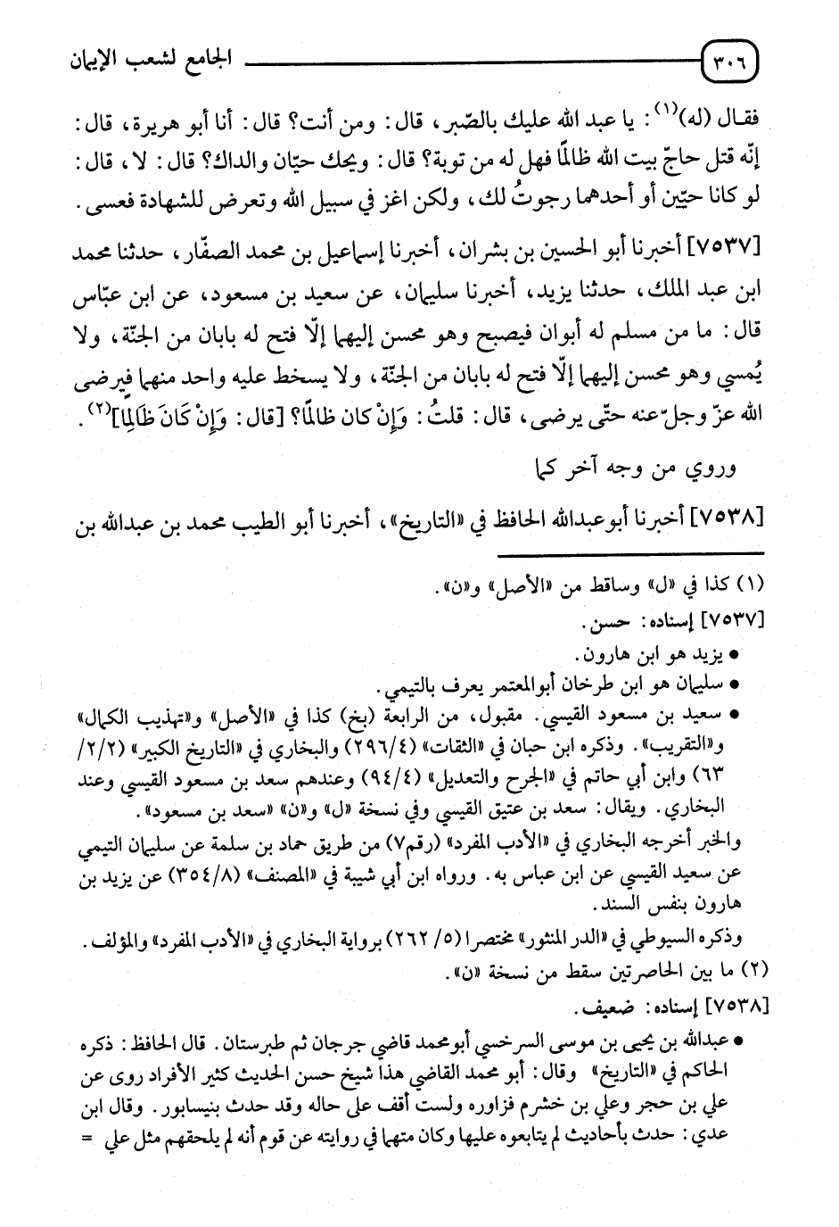7538 - أَخْبَرَنَا أَبُو عَبْدِ اللهِ الْحَافِظُ، فِي التَّارِيخِ، أنا أَبُو الطَّيِّبِ مُحَمَّدُ بْنُ عَبْدِ اللهِ بْنِ -[307]- الْمُبَارَكِ، نا أَبُو مُحَمَّدٍ عَبْدُ اللهِ بْنُ يَحْيَى بْنِ مُوسَى السَّرْخَسِيُّ بِنَيْسَابُورَ، نا سَعِيدُ بْنُ يَعْقُوبَ الطَّالْقَانِيُّ، نا عَبْدُ اللهِ بْنُ الْمُبَارَكِ، عَنْ يَعْقُوبَ بْنِ الْقَعْقَاعِ، عَنْ عَطَاءٍ، عَنِ ابْنِ عَبَّاسٍ، قَالَ: قَالَ رَسُولُ اللهِ صَلَّى اللَّهُ عَلَيْهِ وَسَلَّمَ: §" مَنْ أَصْبَحَ مُطِيعًا فِي وَالِدَيْهِ أَصْبَحَ لَهُ بَابَانِ مَفْتُوحَانِ مِنَ الْجَنَّةِ، وَإِنْ كَانَ وَاحِدًا فَوَاحِدًا، وَمَنْ أَمْسَى عَاصِيًا لِلَّهِ فِي وَالِدَيْهِ أَصْبَحَ لَهُ بَابَانِ مَفْتُوحَانِ مِنَ النَّارِ، وَإِنْ كَانَ وَاحِدًا فَوَاحِدًا " قَالَ الرَّجُلُ: وَإِنْ ظَلَمَاهُ؟ قَالَ: " وَإِنْ ظَلَمَاهُ، وَإِنْ ظَلَمَاهُ، وَإِنْ ظَلَمَاهُ "
