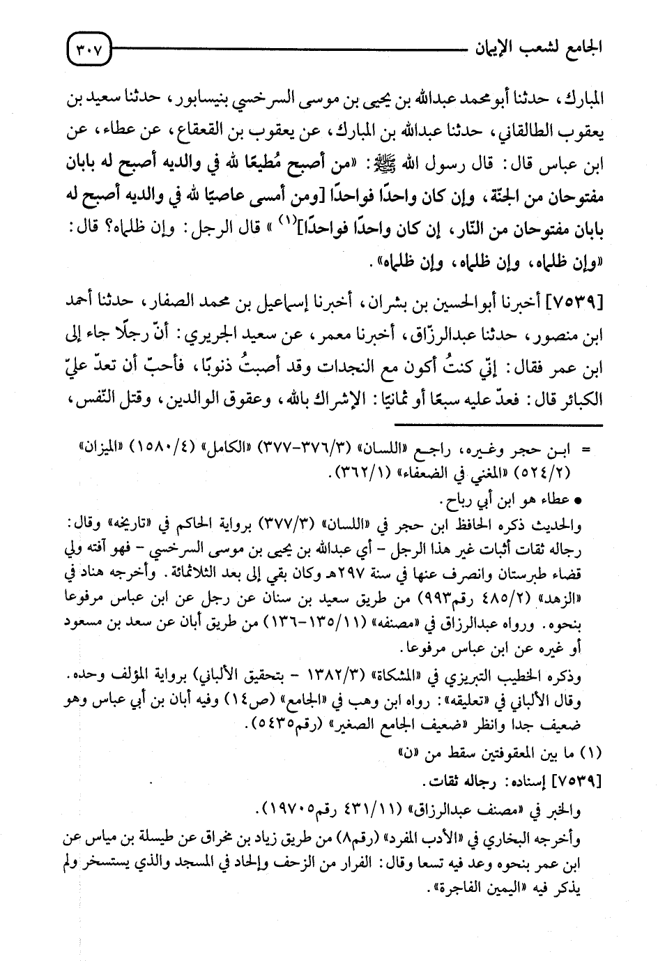 7539 - أَخْبَرَنَا أَبُو الْحُسَيْنِ بْنُ بِشْرَانَ، أنا إِسْمَاعِيلُ بْنُ مُحَمَّدٍ الصَّفَّارُ، نا أَحْمَدُ بْنُ مَنْصُورٍ، نا عَبْدُ الرَّزَّاقِ، نا مَعْمَرٌ، عَنْ سَعِيدٍ الْجُرَيْرِيِّ، أَنَّ رَجُلًا جَاءَ إِلَى ابْنِ عُمَرَ، قَالَ: إِنِّي كُنْتُ أَكُونُ مَعَ النَّجَدَاتِ، وَقَدْ أَصَبْتُ ذَنُوبًا، فَأُحِبُّ أَنْ تَعُدَّ عَلَيَّ الْكَبَائِرَ، فَعَدَّ عَلَيْهِ سَبْعًا أَوْ ثَمَانِيًا: الْإِشْرَاكَ بِاللهِ، وَعُقُوقَ الْوَالِدَيْنِ، وَقَتْلَ النَّفْسِ، -[308]- وَأَكْلَ الرِّبَا، وَأَكْلَ مَالِ الْيَتِيمِ، وَقَذْفَ الْمُحْصَنَةِ، وَالْيَمِينَ الْفَاجِرَةَ، ثُمَّ قَالَ لَهُ ابْنُ عُمَرَ: " §هَلْ لَكَ وَالِدَةٌ؟ " قَالَ: نَعَمْ، قَالَ: " فَأَطْعِمْهَا مِنَ الطَّعَامِ، وأَلِنْ لَهَا مِنَ الْكَلَامِ، فَوَاللهِ لَتَدْخُلَنَّ الْجَنَّةَ " وَقَدْ رُوِيَ فِي هَذَا الْمَعْنَى عَنِ ابْنِ عُمَرَ مَرْفُوعًا فِيمَا تَقَدَّمَ مِنْ هَذَا الْبَابِ