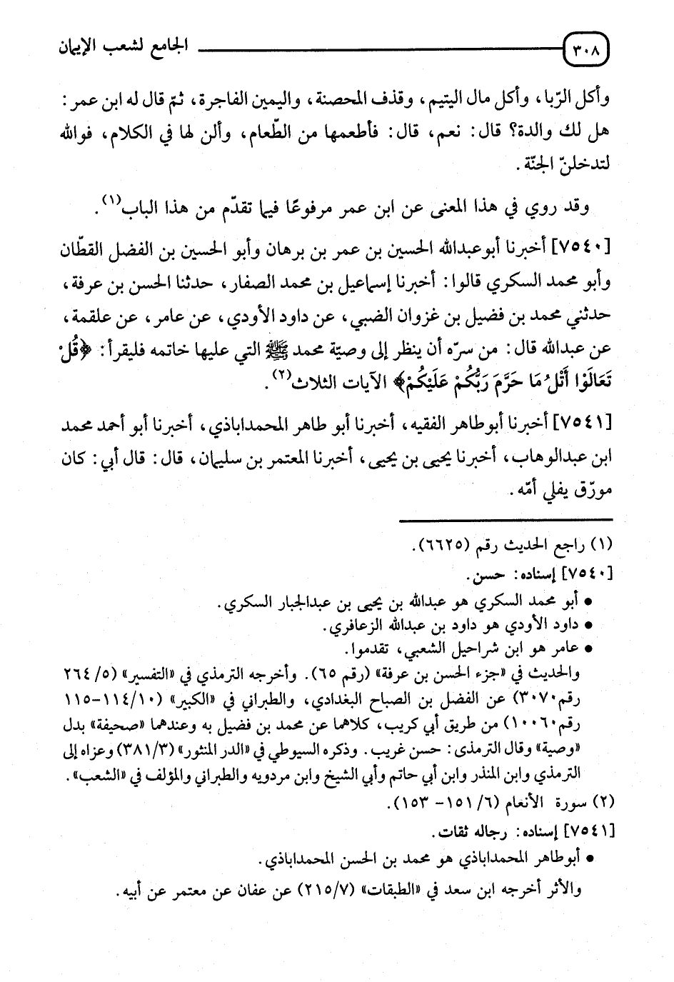 7540 - أَخْبَرَنَا أَبُو عَبْدِ اللهِ الْحُسَيْنُ بْنُ عُمَرَ بْنِ بُرْهَانَ، وَأَبُو الْحُسَيْنِ بْنُ الْفَضْلِ الْقَطَّانُ، وَأَبُو مُحَمَّدٍ السُّكَّرِيُّ، قَالُوا: أنا إِسْمَاعِيلُ بْنُ مُحَمَّدٍ الصَّفَّارُ، نا الْحَسَنُ بْنُ عَرَفَةَ، حَدَّثَنِي مُحَمَّدُ بْنُ فُضَيْلِ بْنِ غَزْوَانَ الضَّبِّيُّ، عَنْ دَاوُدَ الْأَوْدِيِّ، عَنْ عَامِرٍ، عَنْ عَلْقَمَةَ، عَنْ عَبْدِ اللهِ، قَالَ: §" مَنْ سَرَّهُ أَنْ يَنْظُرَ إِلَى وَصِيَّةِ مُحَمَّدٍ صَلَّى اللَّهُ عَلَيْهِ وَسَلَّمَ الَّتِي عَلَيْهَا خَاتِمَةُ أَمْرِهِ فَلْيَقْرَأْ: {قُلْ تَعَالَوْا أَتْلُ مَا حَرَّمَ رَبُّكُمْ عَلَيْكُمْ} [الأنعام: 151] الْآيَاتِ الثَّلَاثِ "