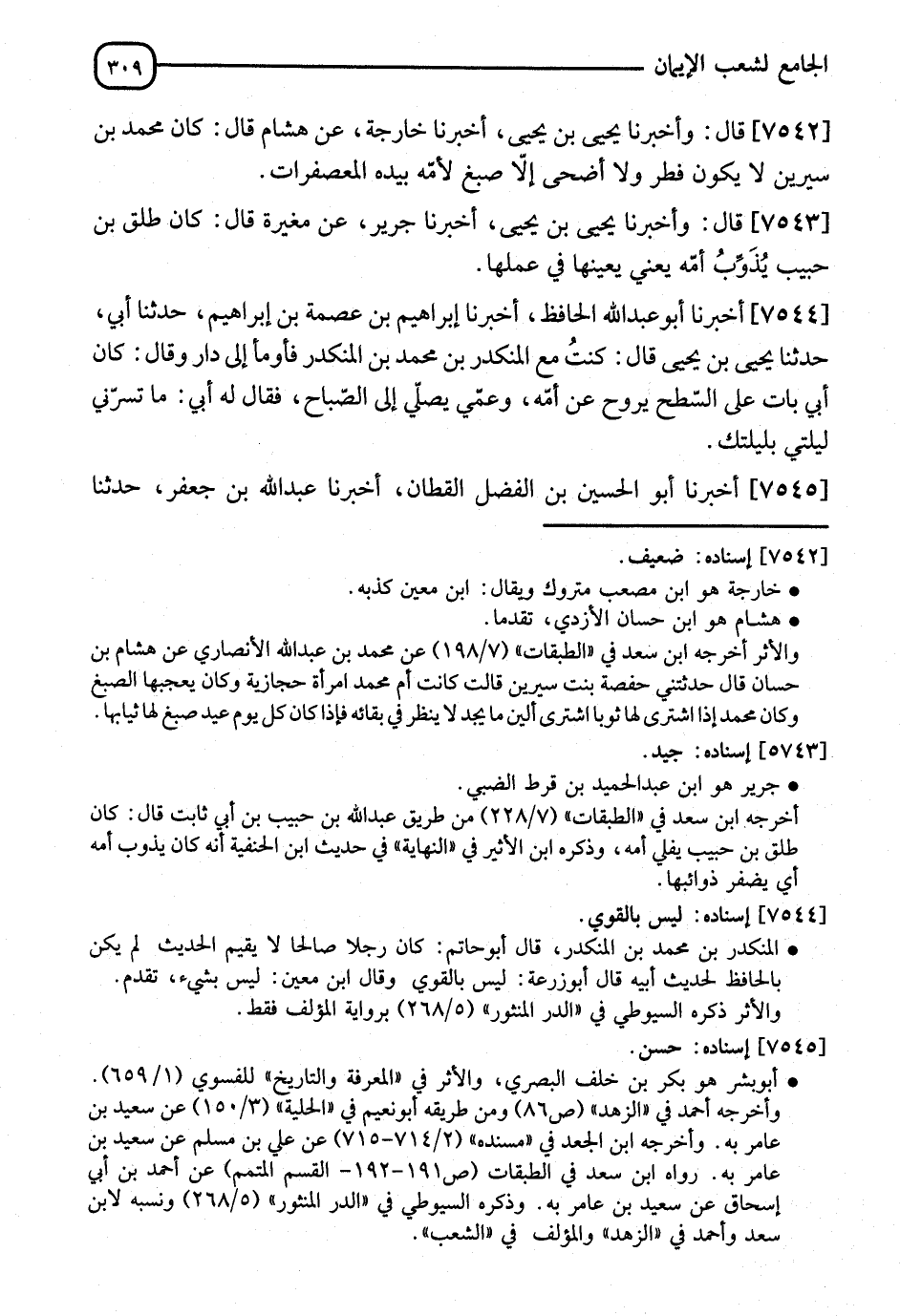 7545 - أَخْبَرَنَا أَبُو الْحُسَيْنِ بْنُ الْفَضْلِ الْقَطَّانُ، أنا عَبْدُ اللهِ بْنُ جَعْفَرٍ، نا -[310]- يَعْقُوبُ بْنُ سُفْيَانَ، حَدَّثَنِي أَبُو بِشْرٍ، نا سَعِيدُ بْنُ عَامِرٍ، عَنْ عَبْدِ اللهِ بْنِ الْمُبَارَكِ، قَالَ: قَالَ مُحَمَّدُ بْنُ الْمُنْكَدِرِ: " §بَاتَ عُمَرُ أَخُوهُ يُصَلِّي، وَبِتُّ أَغْمُرُ رِجْلَ أُمِّي، وَأُحِبُّ أَنَّ لَيْلَتِي بِلَيْلَتِهِ "