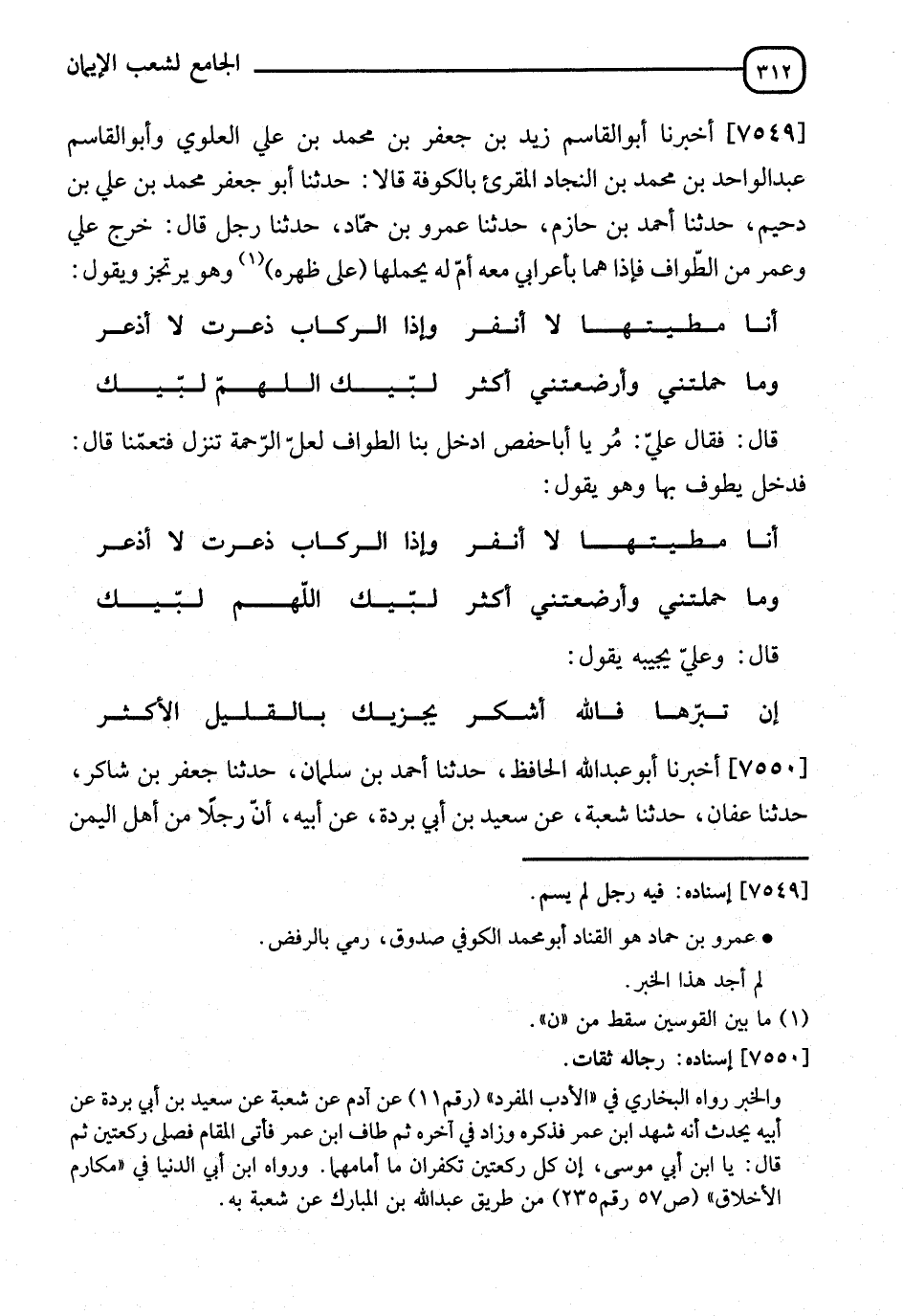 7549 - أَخْبَرَنَا أَبُو الْقَاسِمِ زَيْدُ بْنُ جَعْفَرِ بْنِ مُحَمَّدِ بْنِ عَلِيٍّ الْعَلَوِيُّ، وَأَبُو الْقَاسِمِ عَبْدُ الْوَاحِدِ بْنُ مُحَمَّدِ بْنِ النَّجَّارِ الْمُقْرِئُ بِالْكُوفَةِ، قَالَا: أنا أَبُو جَعْفَرِ بْنُ عَلِيِّ بْنِ دُحَيْمٍ، نا أَحْمَدُ بْنُ حَازِمٍ، نا عَمْرُو بْنُ حَمَّادٍ، نا رَجُلٌ، قَالَ: خَرَجَ عَلِيٌّ، وَعُمَرُ مِنَ الطَّوَافِ فَإِذَا هُمَا بِأَعْرَابِيٍّ مَعَهُ أُمٌّ لَهُ يَحْمِلُهَا عَلَى ظَهْرِهِ، وَهُوَ يَرْتَجِزُ وَيَقُولُ: