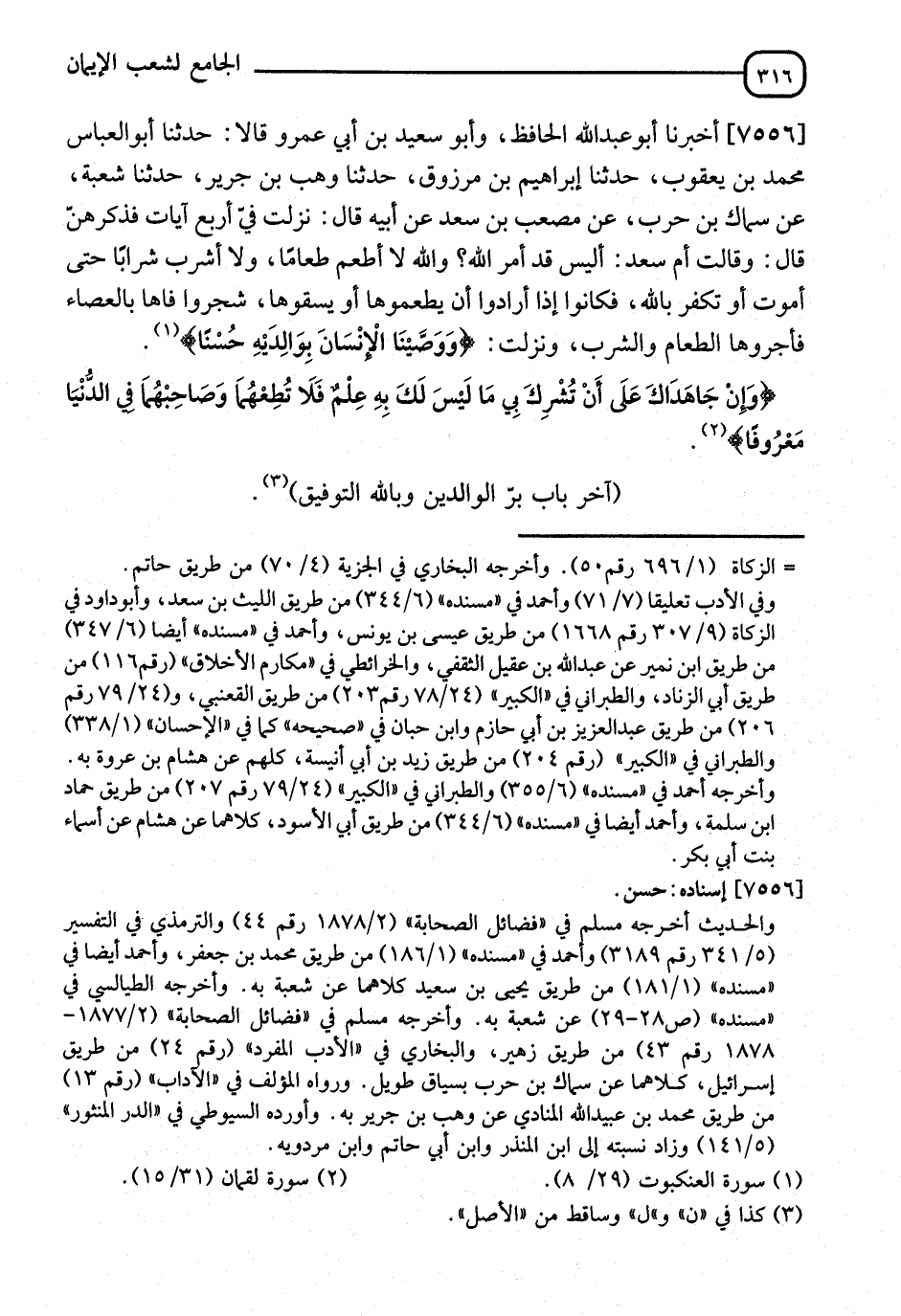 7556 - أَخْبَرَنَا أَبُو عَبْدِ اللهِ الْحَافِظُ، وَأَبُو سَعِيدِ بْنُ أَبِي عُمَرَ، قَالَا: نا أَبُو الْعَبَّاسِ مُحَمَّدُ بْنُ يَعْقُوبَ، نا إِبْرَاهِيمُ بْنُ مَرْزُوقٍ، نا وَهْبُ بْنُ جَرِيرٍ، نا شُعْبَةُ، عَنْ سِمَاكِ بْنِ حَرْبٍ، عَنْ مُصْعَبِ بْنِ سَعْدٍ، عَنْ أَبِيهِ، قَالَ: " نَزَلَتْ فِيَّ أَرْبَعُ آيَاتٍ، فَذَكَّرَهُنَّ "، قَالَ: " وَقَالَتْ أُمُّ سَعْدٍ: أَلَيْسَ قَدْ أَمَرَ اللهُ بِبِرِّ الْوَالِدَةِ؟ وَاللهِ لَا أَطْعَمُ طَعَامًا وَلَا أَشْرَبُ شَرَابًا حَتَّى أَمُوتَ أَوْ تُكْفُرَ بِاللهِ، فَكَانُوا إِذَا أَرَادُوا أَنْ يُطْعِمُوهَا أَوْ يَسْقُوهَا سَجَرُوا فَاهَا بِالْعَصَا، وَأَدْخَلُوا الطَّعَامَ وَالشَّرَابَ، فَنَزَلَتْ: {§وَوَصَّيْنَا الْإِنْسَانَ بِوَالِدَيْهِ حُسْنًا} [العنكبوت: 8] {وَإِنْ جَاهَدَاكَ عَلَى أَنْ تُشْرِكَ بِي مَا لَيْسَ لَكَ بِهِ عِلْمٌ فَلَا تُطِعْهُمَا وَصَاحِبْهُمَا فِي الدُّنْيَا مَعْرُوفًا} [لقمان: 15] "
