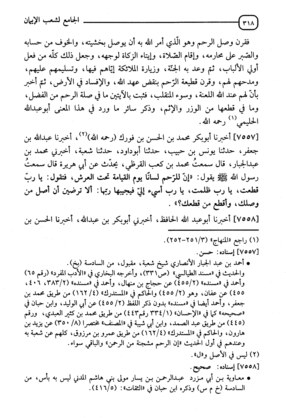 7558 - أَخْبَرَنَا أَبُو عَبْدِ اللهِ الْحَافِظُ، أَخْبَرَنِي أَبُو بَكْرِ بْنُ عَبْدِ اللهِ، أنا الْحَسَنُ بْنُ -[319]- سُفْيَانَ، نا قُتَيْبَةُ بْنُ سَعِيدٍ، نا حَاتِمُ بْنُ إِسْمَاعِيلَ، عَنْ مُعَاوِيَةَ بْنِ أَبِي مُزَرِّدٍ، مَوْلَى بَنِي هَاشِمٍ، حَدَّثَنِي أَبُو الْحُبَابِ سَعِيدُ بْنُ يَسَارٍ، عَنْ أَبِي هُرَيْرَةَ، قَالَ: قَالَ رَسُولُ اللهِ صَلَّى اللَّهُ عَلَيْهِ وَسَلَّمَ: " إِنَّ اللهَ تَعَالَى خَلَقَ الْخَلْقَ، حَتَّى إِذَا فَرَغَ مِنْهُمْ قَامَتِ الرَّحِمُ فَأَخَذَتْ بِحَقْوِ الرَّحْمَنِ، فَقَالَ: مَهْ، فَقَالَتْ: هَذَا مَكَانُ الْعَائِذِ مِنَ الْقَطِيعَةِ؟ قَالَ: نَعَمْ، §أَمَا تَرْضَيْنَ أَنْ أَصِلَ مَنْ وَصَلَكِ، وَأَقْطَعَ مَنْ قَطَعَكِ؟ قَالَتْ: بَلَى، قَالَ: فَذَاكَ لَكِ "، ثُمَّ قَالَ رَسُولُ اللهِ صَلَّى اللَّهُ عَلَيْهِ وَسَلَّمَ: " اقْرَأُوا إِنْ شِئْتُمْ: {فَهَلْ عَسَيْتُمْ إِنْ تَوَلَّيْتُمْ أَنْ تُفْسِدُوا فِي الْأَرْضِ، وَتُقَطِّعُوا أَرْحَامَكُمْ أُولَئِكَ الَّذِينَ لَعَنَهُمُ اللهُ، فَأَصَمَّهُمْ وَأَعْمَى أَبْصَارَهُمْ أَفَلَا يَتَدَبَّرُونَ الْقُرْآنَ أَمْ عَلَى قُلُوبٍ أَقْفَالُهَا} [محمد: 23] " رَوَاهُ الْبُخَارِيُّ، عَنْ إِبْرَاهِيمَ بْنِ حَمْزَةَ، عَنْ حَاتِمٍ، وَرَوَاهُ مُسْلِمٌ، عَنْ قُتَيْبَةَ، قَوْلُهُ: " فَأَخَذَتْ بِحَقْوِ الرَّحْمَنِ " مَعْنَاهُ: اسْتَجَارَتْ بِاللهِ، واعْتَصَمَتْ بِهِ، كَمَا تَقُولُ -[320]- الْعَرَبُ: تَعَلَّقْتُ بِظِلِّ جَنَاحِهِ، أَيِ اعْتَصَمْتُ بِهِ، وَقِيلَ: الْحِقْوُ: لِلْإِزَارِ، وَإِزَارُ اللهِ عَزَّ جَلَّ عِزُّهُ، وَمَعْنَاهُ أَنَّهُ مَوْصُوفٌ بِالْعِزِّ، فَاسْتَعَاذَتِ الرَّحِمُ بِعِزِّ اللهِ مِنَ الْقَطِيعَةِ، وَلَاذَتْ بِهِ، وَقِيلَ: مَعْنَاهُ الْعَرْشُ، فَقَدْ رُوِيَ فِي هَذَا الْخَبَرِ أَنَّهُ قَالَ: الرَّحِمُ مُعَلَّقَةٌ بِالْعَرْشِ "