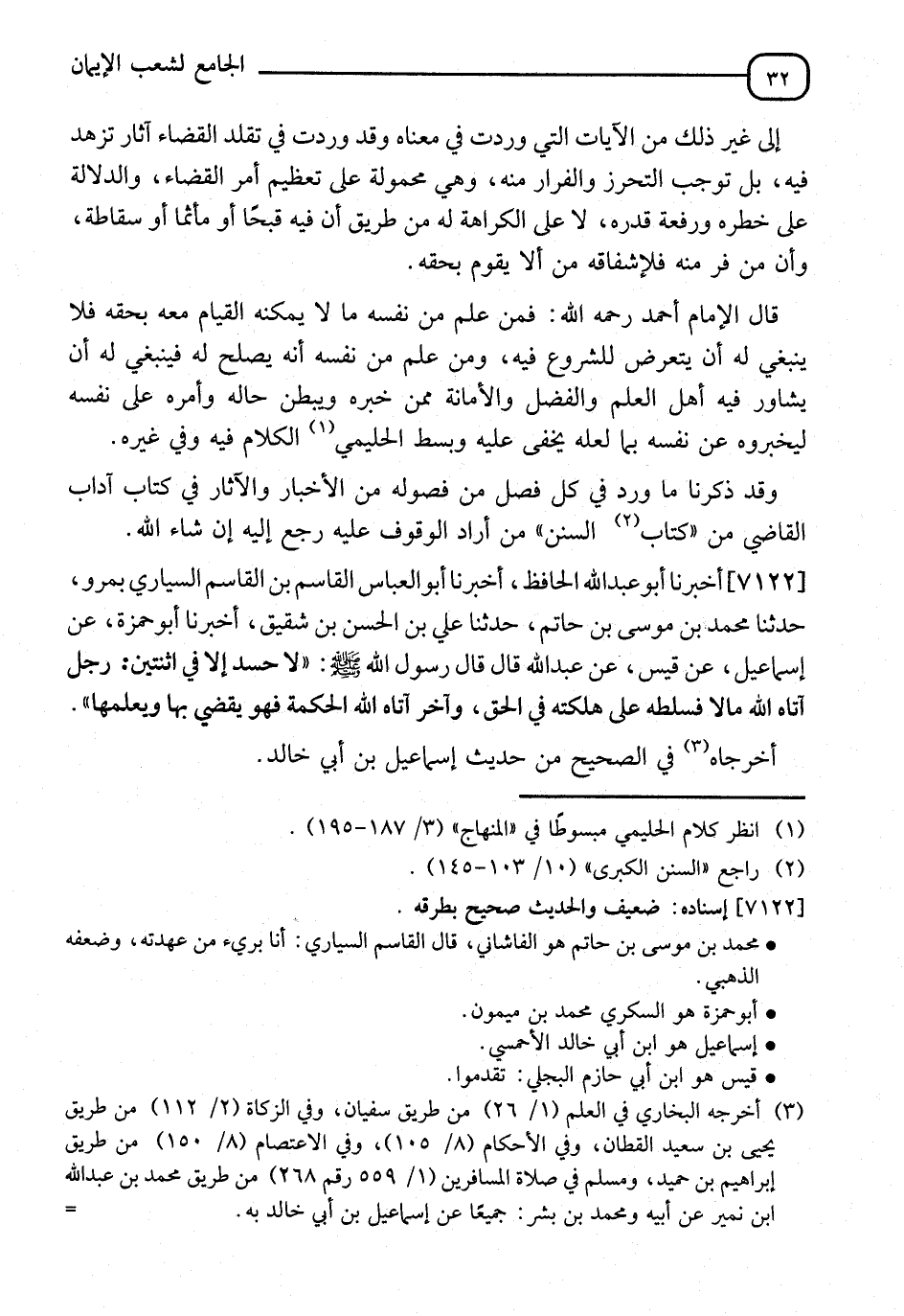 7122 - أَخْبَرَنَا أَبُو عَبْدِ اللهِ الْحَافِظُ، أنا أَبُو الْعَبَّاسِ الْقَاسِمُ بْنُ الْقَاسِمِ السَّيَّارِيُّ بِمَرْوَ، نا مُحَمَّدُ بْنُ مُوسَى بْنِ حَاتِمٍ، نا عَلِيُّ بْنُ الْحَسَنِ بْنِ شَقِيقٍ، أنا أَبُو حَمْزَةَ، عَنْ إِسْمَاعِيلَ بْنِ قَيْسٍ، عَنِ عَبْدِ اللهِ، قَالَ: قَالَ رَسُولُ اللهِ صَلَّى اللَّهُ عَلَيْهِ وَسَلَّمَ: §" لَا حَسَدَ إِلَّا فِي اثْنَتَيْنِ رَجُلٍ آتَاهُ اللهُ مَالًا فَسَلَّطَهُ عَلَى هَلَكَتِهِ فِي الْحَقِّ، وَآخَرَ آتَاهُ اللهُ الْحِكْمَةَ فَهُوَ يَقْضِي بِهَا وَيُعَلِّمُهَا " أَخْرَجَاهُ فِي الصَّحِيحِ مِنْ حَدِيثِ إِسْمَاعِيلَ بْنِ أَبِي خَالِدٍ