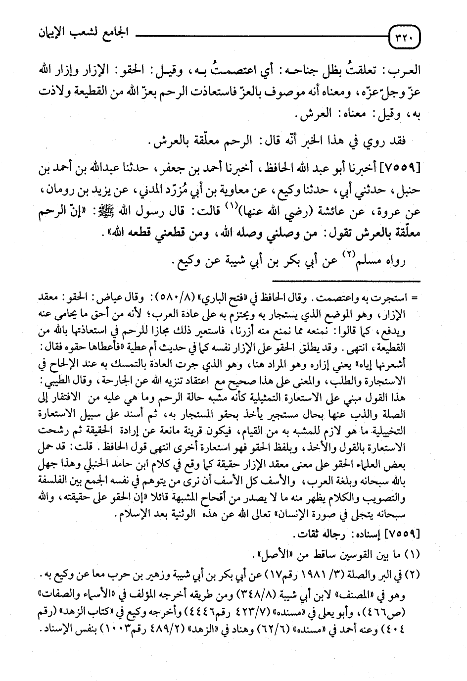 7559 - أَخْبَرَنَا أَبُو عَبْدِ اللهِ الْحَافِظُ، أنا أَحْمَدُ بْنُ جَعْفَرٍ، نا عَبْدُ اللهِ بْنُ أَحْمَدَ بْنِ حَنْبَلٍ، حَدَّثَنِي أَبِي، نا وَكِيعٌ، عَنْ مُعَاوِيَةَ بْنِ أَبِي مُزَرِّدٍ الْعَدَنِيِّ، عَنْ يَزِيدَ بْنِ رُومَانَ، عَنْ عُرْوَةَ، عَنْ عَائِشَةَ، قَالَتْ: قَالَ رَسُولُ اللهِ صَلَّى اللَّهُ عَلَيْهِ وَسَلَّمَ: " إِنَّ §الرَّحِمَ مُعَلَّقَةٌ بِالْعَرْشِ تَقُولُ: مَنْ وَصَلَنِي وَصَلَهُ اللهُ، وَمَنْ قَطَعَنِي قَطَعَهُ اللهُ " رَوَاهُ مُسْلِمٌ، عَنْ أَبِي بَكْرِ بْنِ أَبِي شَيْبَةَ، عَنْ وَكِيعٍ