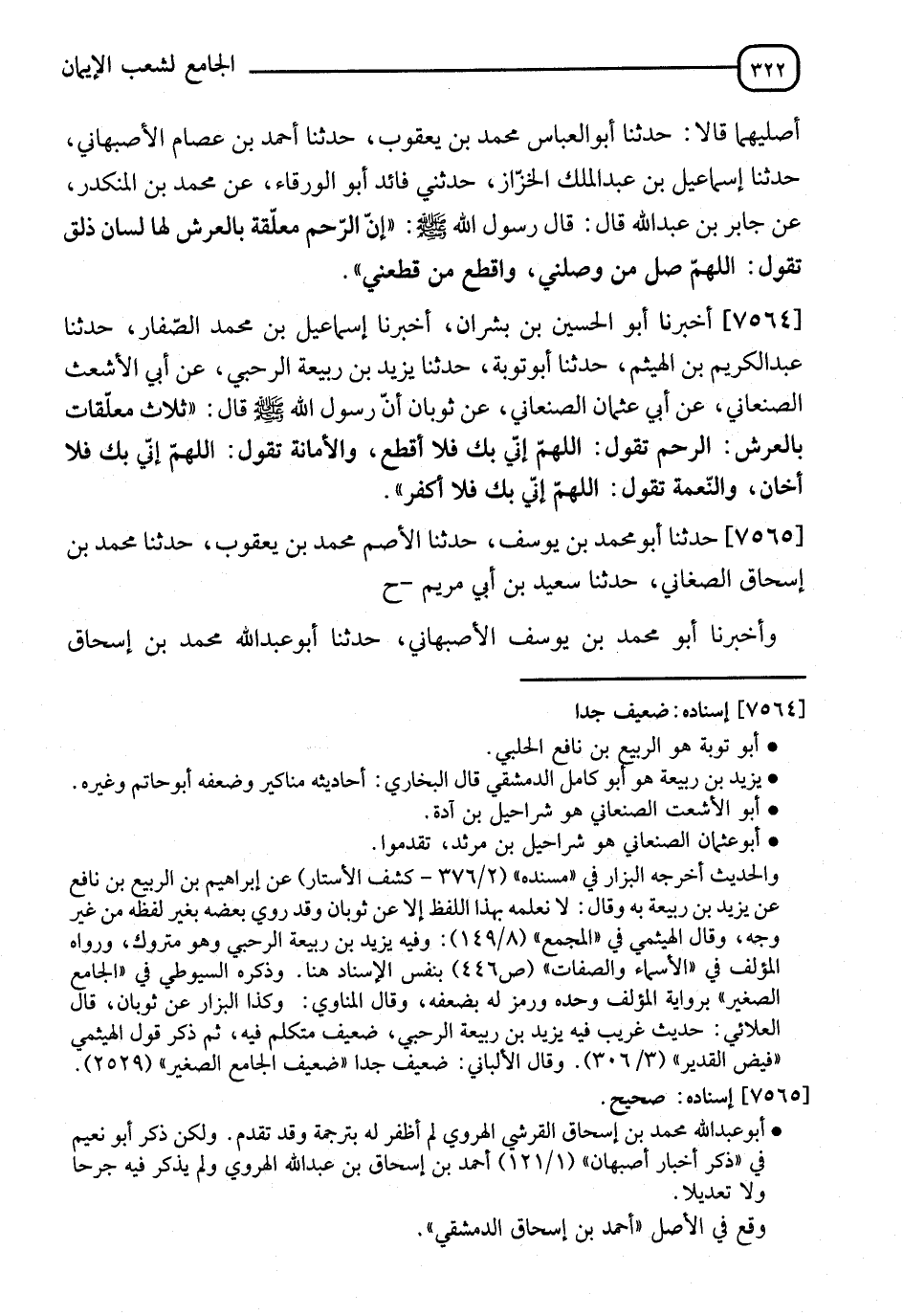 7564 - أَخْبَرَنَا أَبُو الْحُسَيْنِ بْنُ بِشْرَانَ، أنا إِسْمَاعِيلُ بْنُ مُحَمَّدٍ الصَّفَّارُ، نا عَبْدُ الْكَرِيمِ بْنُ الْهَيْثَمِ، نا أَبُو تَوْبَةَ، نا يَزِيدُ بْنُ رَبِيعَةَ الرَّحْبِيُّ، عَنْ أَبِي الْأَشْعَثِ الصَّغَانِيُّ، عَنْ أَبِي عُثْمَانَ الصَّغَانِيُّ، عَنْ ثَوْبَانَ، أَنَّ رَسُولَ اللهِ صَلَّى اللَّهُ عَلَيْهِ وَسَلَّمَ، قَالَ: " §ثَلَاثٌ مُعَلَّقَاتٌ بِالْعَرْشِ: الرَّحِمُ يَقُولُ: اللهُمَّ إِنِّي بِكَ فَلَا أُقْطَعُ، وَالْأَمَانَةُ تَقُولُ: اللهُمَّ إِنِّي بِكَ فَلَا أُخْتَانُ، وَالنِّعْمَةُ تَقُولُ: اللهُمَّ إِنِّي بِكَ فَلَا أُكْفَرُ "