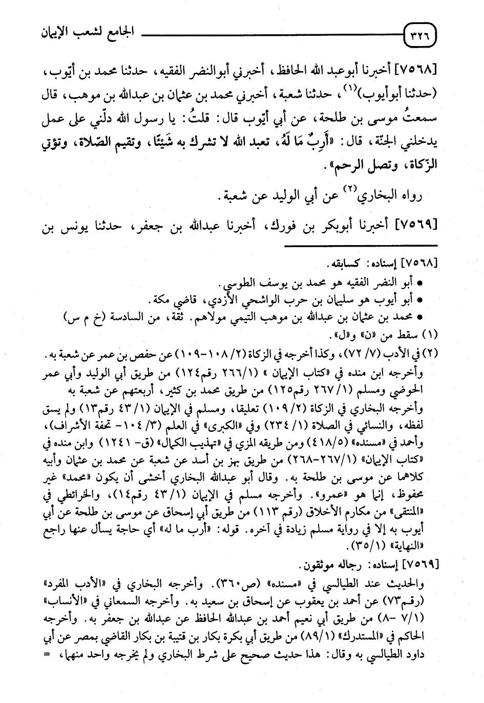 7568 - أَخْبَرَنَا أَبُو عَبْدِ اللهِ الْحَافِظُ، أَخْبَرَنِي أَبُو النَّضْرِ الْفَقِيهُ، نا مُحَمَّدُ بْنُ أَيُّوبَ، أَخْبَرَنِي أَبُو أَيُّوبَ، نا شُعْبَةُ، أَخْبَرَنِي مُحَمَّدُ بْنُ عُثْمَانَ بْنِ عَبْدِ اللهِ بْنِ مَوْهَبٍ، قَالَ: سَمِعْتُ مُوسَى بْنَ طَلْحَةَ، عَنْ أَبِي أَيُّوبَ، قَالَ: قُلْتُ: يَا رَسُولَ اللهِ، دُلَّنِي عَلَى عَمَلٍ يُدْخِلُنِي الْجَنَّةَ، قَالَ: " §تَعْبُدُ اللهَ لَا تُشْرِكُ بِهِ شَيْئًا، وَتُقِيمُ الصَّلَاةَ، وَتُؤْتِي الزَّكَاةَ، وَتَصِلُ الرَّحِمَ " قَالَهُ الْبُخَارِيُّ، عَنْ أَبِي الْوَلِيدِ عَنْ شُعْبَةَ