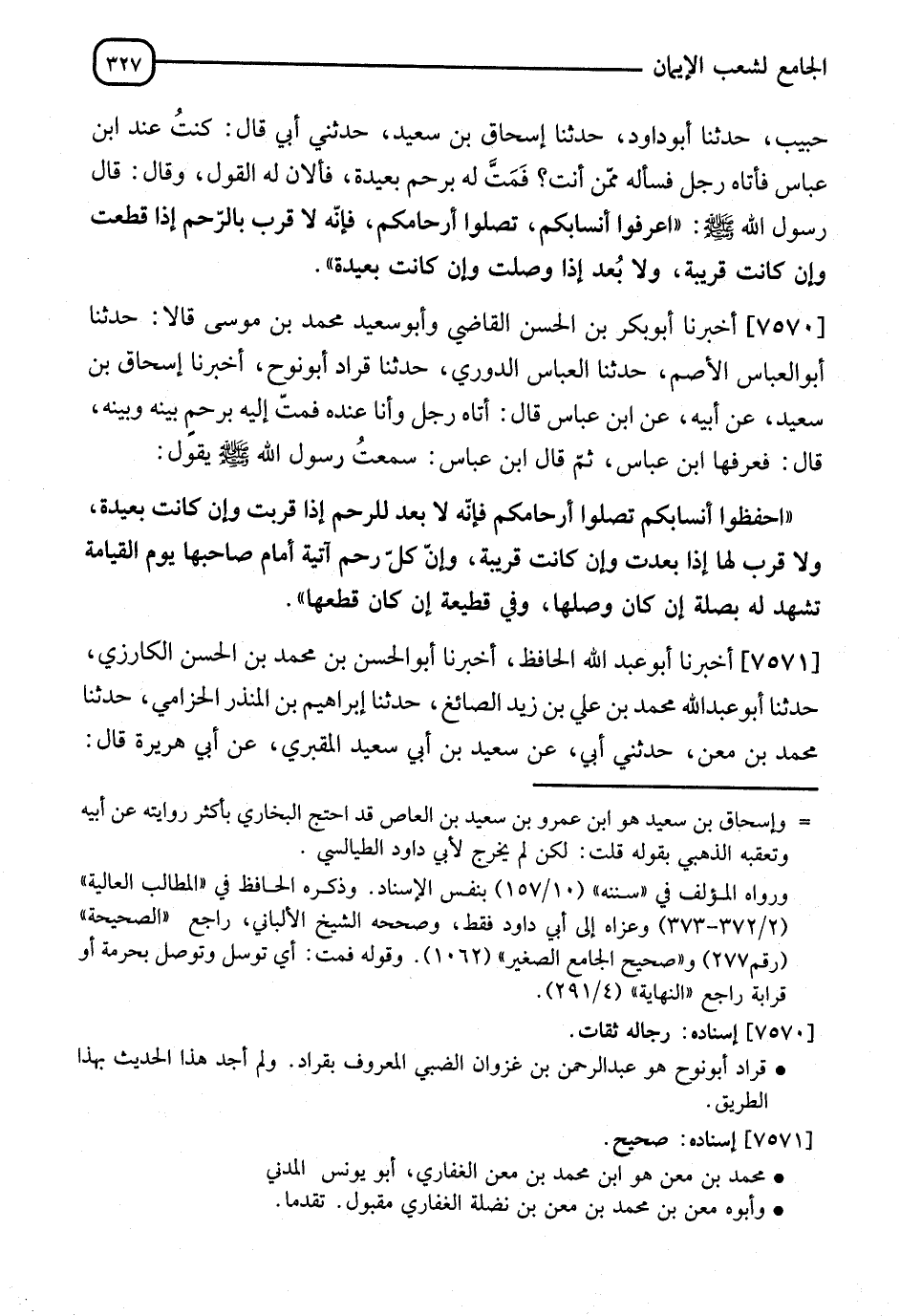 7570 - أَخْبَرَنَا أَبُو بَكْرِ بْنُ الْحَسَنِ الْقَاضِي، وَأَبُو سَعِيدٍ مُحَمَّدُ بْنُ مُوسَى، قَالَا: نا أَبُو الْعَبَّاسِ الْأَصَمُّ، نا الْعَبَّاسُ الدُّورِيُّ، نا قُرَادٌ أَبُو نُوحٍ، أنا إِسْحَاقُ بْنُ سَعِيدٍ، عَنْ أَبِيهِ، عَنِ ابْنِ عَبَّاسٍ، قَالَ: أَتَاهُ رَجُلٌ وَأَنَا عِنْدَهُ، فَمَتَّ إِلَيْهِ بِرَحِمٍ بَيْنَهُ وَبَيْنَهُ، قَالَ: فَعَرَفَهَا ابْنُ عَبَّاسٍ، ثُمَّ قَالَ ابْنُ عَبَّاسٍ: سَمِعْتُ رَسُولَ اللهِ صَلَّى اللَّهُ عَلَيْهِ وَسَلَّمَ يَقُولُ: §" احْفَظُوا أَنْسَابَكُمْ تَصِلُوا أَرْحَامَكُمْ، فَإِنَّهُ لَا بُعْدَ لِلرَّحِمِ إِذَا قُرِّبَتْ، وَإِنْ كَانَتْ بَعِيدَةً، وَلَا قُرْبَ لَهَا إِذَا بَعُدَتْ وَإِنْ كَانَتْ قَرِيبَةً، وَإِنَّ كُلَّ رَحِمٍ آتِيَةٌ أَمَامَ صَاحِبِهَا يَوْمَ الْقِيَامَةِ تَشْهَدُ لَهُ بِصِلَةٍ إِنْ كَانَ وَصَلَهَا، وَفِي قَطِيعَةٍ إِنْ كَانَ قَطَعَهَا "