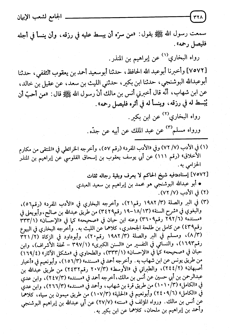 7572 - وَأَخْبَرَنَا أَبُو عَبْدِ اللهِ الْحَافِظُ، نا أَبُو سَعِيدٍ أَحْمَدُ بْنُ يَعْقُوبَ الثَّقَفِيُّ، نا أَبُو عَبْدِ اللهِ الْبُوشَنْجِيُّ، نا ابْنُ بُكَيْرٍ، حَدَّثَنِي اللَّيْثُ بْنُ سَعْدٍ، عَنْ عُقَيْلِ بْنِ خَالِدٍ، عَنِ ابْنِ شِهَابٍ، أَنَّهُ قَالَ: أَخْبَرَنِي أَنَسُ بْنُ مَالِكٍ، أَنَّ رَسُولَ اللهِ صَلَّى اللَّهُ عَلَيْهِ وَسَلَّمَ قَالَ: " §مَنْ أَحَبَّ أَنْ يُبْسَطَ لَهُ فِي رِزْقِهِ، وَيُنْسَأَ لَهُ فِي أَثَرِهِ فَلْيَصِلْ رَحِمَهُ " رَوَاهُ الْبُخَارِيُّ، عَنِ ابْنِ بُكَيْرٍ، وَرَوَاهُ مُسْلِمٌ، عَنْ عَبْدِ الْمَلِكِ، عَنْ أَبِيهِ، عَنْ جَدِّهِ