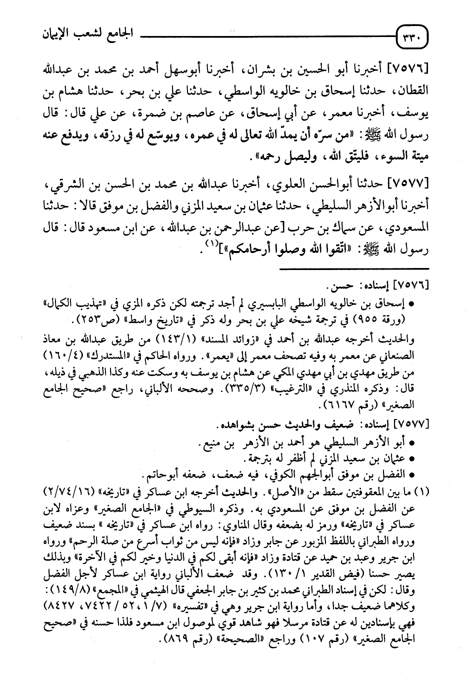 7576 - أَخْبَرَنَا أَبُو الْحُسَيْنِ بْنُ بِشْرَانَ، أنا أَبُو سَهْلٍ أَحْمَدُ بْنُ مُحَمَّدِ بْنِ عَبْدِ اللهِ الْقَطَّانُ، نا إِسْحَاقُ بْنُ خَالَوَيْهِ الْوَاسِطِيُّ، نا عَلِيُّ بْنُ بَحْرٍ، نا هِشَامُ بْنُ يُوسُفَ، أنا مَعْمَرٌ، عَنْ أَبِي إِسْحَاقَ، عَنْ عَاصِمِ بْنِ ضَمْرَةَ، عَنْ عَلِيٍّ، قَالَ: قَالَ رَسُولُ اللهِ صَلَّى اللَّهُ عَلَيْهِ وَسَلَّمَ: " §مَنْ سَرَّهُ أَنْ يَمُدَّ اللهُ تَعَالَى لَهُ فِي عُمُرِهِ، وَيُوَسَّعَ لَهُ فِي رِزْقِهِ، وَيُدْفَعَ عَنْ مِيتَةِ السَّوْءِ، فَلْيَتَّقِ اللهَ، وَلْيَصِلْ رَحِمَهُ " " وَيَعْنِي بِالنَّسْءِ: أَنْ يُوَفَّقَ لَهُ فَيَقُومَ بِاللَّيْلِ فَهُوَ النَّسْأُ، لَيْسَ الزِّيَادَةَ فِي الْأَجَلِ، كَذَا قَالَ "