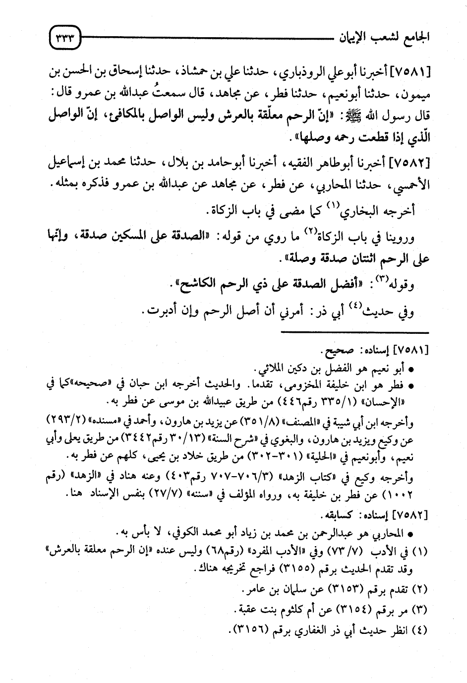 7582 - أَخْبَرَنَا أَبُو طَاهِرٍ الْفَقِيهُ، أنا أَبُو حَامِدِ بْنُ بِلَالٍ، نا مُحَمَّدُ بْنُ إِسْمَاعِيلَ الْأَحْمَسِيُّ، نا الْمُحَارِبِيُّ، عَنْ قَطَنٍ، عَنْ مُجَاهِدٍ، عَنْ عَبْدِ اللهِ بْنِ عَمْرٍو، فَذَكَرَهُ بِمِثْلِهِ، أَخْرَجَهُ الْبُخَارِيُّ كَمَا مَضَى فِي بَابِ الزَّكَاةِ، وَرُوِّينَا فِي بَابِ الزَّكَاةِ مَا رُوِيَ مِنْ قَوْلِهِ: " الصَّدَقَةُ عَلَى الْمِسْكِينِ صَدَقَةٌ، وَإِنَّهَا عَلَى ذِي الرَّحِمِ اثْنَتَانِ: صَدَقَةٌ وَصِلَةٌ "، وَقَوْلُهُ: " أَفْضَلُ الصَّدَقَةِ عَلَى ذِي الرَّحِمِ الْكَاشِحِ "، وَفِي حَدِيثِ أَبِي ذَرٍّ: أَمَرَنِي أَنْ أَصِلَ الرَّحِمَ وَإِنْ أَدْبَرَتْ، -[334]- وَحَدِيثُ صَدَقَةِ أَبِي طَلْحَةَ، وَحَدِيثُ إِعْتَاقِ مَيْمُونَةَ، وَحَدِيثُ زَيْنَبَ امْرَأَةِ ابْنِ مَسْعُودٍ، وَغَيْرُ ذَلِكَ مِمَّا يَتَّصِلُ بِصِلَةِ الرَّحِمِ، وَحِفْظِ الْقَرَابَةِ