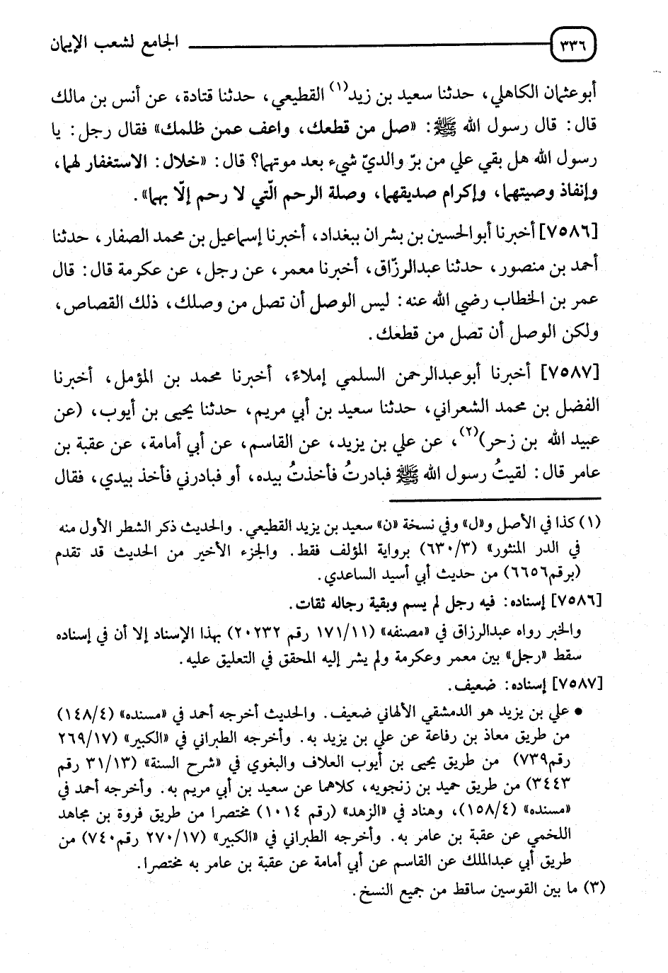 7587 - حَدَّثَنَا أَبُو عَبْدِ الرَّحْمَنِ السُّلَمِيُّ، إِمْلَاءً، نا مُحَمَّدُ بْنُ الْمُؤَمَّلِ، أنا الْفَضْلُ بْنُ مُحَمَّدٍ الشَّعْرَانِيُّ، نا سَعِيدُ بْنُ أَبِي مَرْيَمَ، نا يَحْيَى بْنُ أَيُّوبَ، عَنْ عَلِيِّ بْنِ يَزِيدَ، عَنِ الْقَاسِمِ، عَنْ أَبِي أُمَامَةَ، عَنْ عُقْبَةَ بْنِ عَامِرٍ، قَالَ: لَقِيتُ رَسُولَ اللهِ صَلَّى اللَّهُ عَلَيْهِ وَسَلَّمَ فَبَادَرْتُ فَأَخَذْتُ بِيَدِهِ - أَوْ فَبَادَرَنِي فَأَخَذَ بِيَدِي - فَقَالَ -[337]- لِي: " يَا عُقْبَةُ، أَلَا أُخْبِرُكَ بِأَفْضَلِ أَخْلَاقِ أَهْلِ الدُّنْيَا وَالْآخِرَةِ؟ §تَصِلُ مَنْ قَطَعَكَ، وَتُعْطِي مَنْ حَرَمَكَ، وَتَعْفُو عَمَّنْ ظَلَمَكَ، أَلَا وَمَنْ أَرَادَ أَنْ يُمَدَّ لَهُ فِي عُمُرِهِ، وَيُوَسَّعَ لَهُ رِزْقُهُ فَلْيَصِلْ ذَا رَحِمٍ مِنْهُ " رَوَاهُ ابْنُ وَهْبٍ، عَنْ يَحْيَى بْنِ أَيُّوبَ، عَنْ عُبَيْدِ اللهِ بْنِ زَحْرٍ، عَنِ الْقَاسِمِ