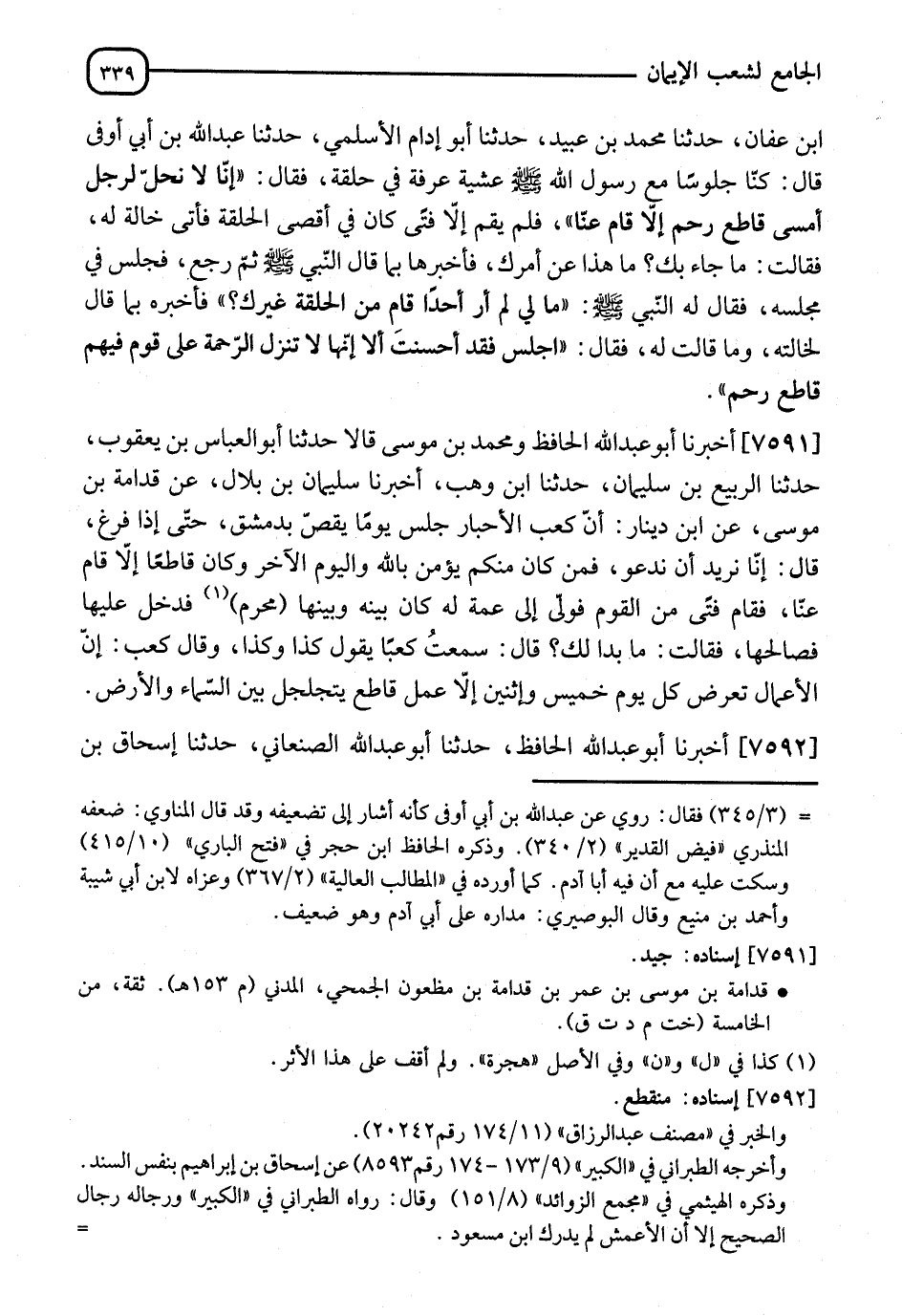 7592 - أَخْبَرَنَا أَبُو عَبْدِ اللهِ الْحَافِظُ، أنا أَبُو عَبْدِ اللهِ الصَّغَانِيُّ، نا إِسْحَاقُ بْنُ -[340]- إِبْرَاهِيمَ، نا عَبْدُ الرَّزَّاقِ، عَنْ مَعْمَرٍ، عَنِ الْأَعْمَشِ، قَالَ: كَانَ ابْنُ مَسْعُودٍ جَالِسًا بَعْدَ الصُّبْحِ فِي حَلْقَةٍ، فَقَالَ: " أَنْشُدُ اللهَ قَاطِعَ الرَّحِمِ إِمَّا قَامَ عَنَّا، فَإِنَّا نُرِيدُ أَنْ نَدْعُوَا رَبَّنَا، وَإِنَّ §أَبْوَابَ السَّمَاءِ مُرَتَجَةٌ دُونَ قَاطِعِ الرَّحِمِ "