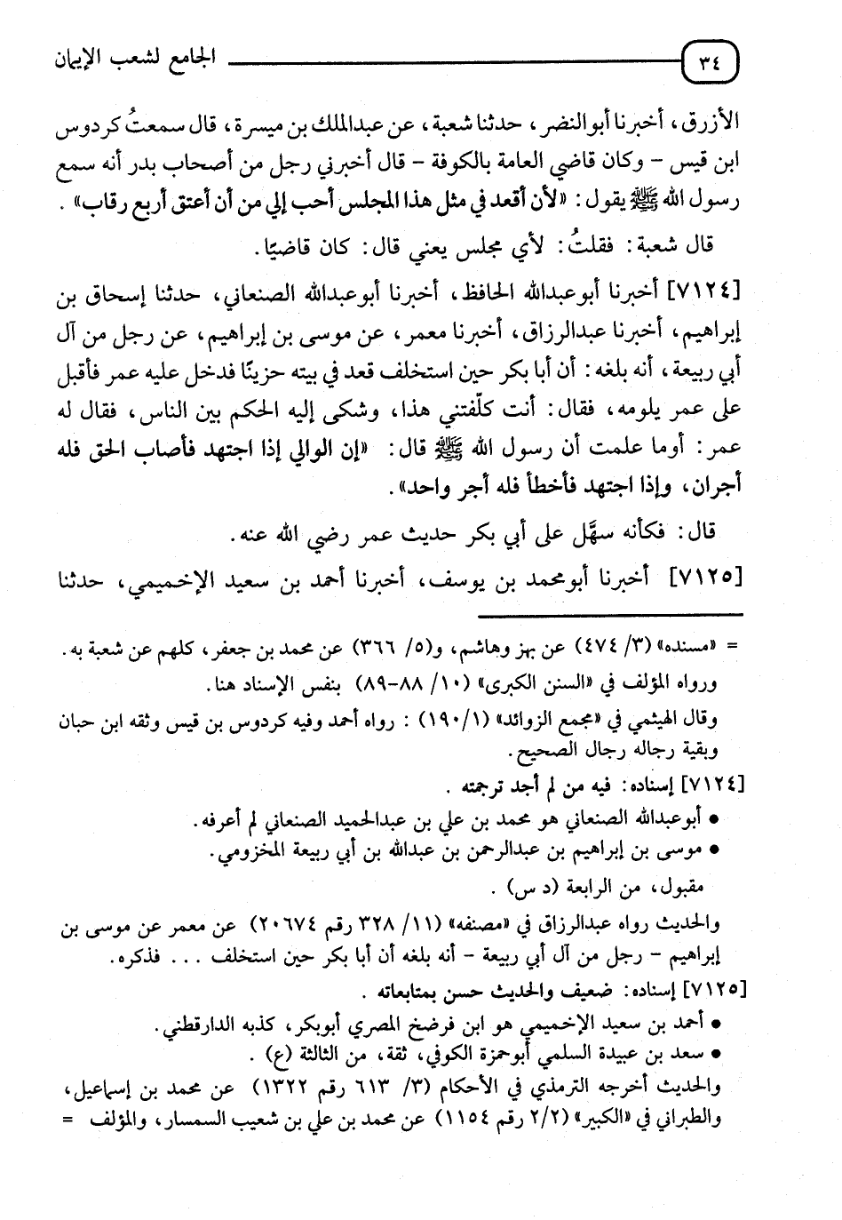 7124 - أَخْبَرَنَا أَبُو عَبْدِ اللهِ الْحَافِظُ، أنا أَبُو عَبْدِ اللهِ الصَّنْعَانِيُّ، نا إِسْحَاقُ بْنُ إِبْرَاهِيمَ، أنا عَبْدُ الرَّزَّاقِ، أنا مَعْمَرٌ، عَنْ مُوسَى بْنِ إِبْرَاهِيمَ، عَنْ رَجُلٍ، مِنْ آلِ أَبِي رَبِيعَةَ، أَنَّهُ بَلَغَهُ أَنَّ أَبَا بَكْرٍ، حِينَ اسْتُخْلِفَ قَعَدَ فِي بَيْتِهِ حَزِينًا فَدَخَلَ عَلَيْهِ عُمَرُ، فَأَقْبَلَ عَلَى عُمَرَ يَلُومُهُ، فَقَالَ: أَنْتَ كَلَّفْتَنِي هَذَا، وَشَكَا إِلَيْهِ الْحُكْمَ بَيْنَ النَّاسِ، فَقَالَ عُمَرُ: أَوَ مَا عَلِمْتَ أَنَّ رَسُولَ اللهِ صَلَّى اللَّهُ عَلَيْهِ وَسَلَّمَ، قَالَ: " إِنَّ §الْوَالِي إِذَا اجْتَهَدَ فَأَصَابَ الْحَقَّ فَلَهُ أَجْرَانِ، وَإِذَا اجْتَهَدَ فَأَخْطَأَ فَلَهُ أَجْرٌ وَاحِدٌ " قَالَ: وَكَأَنَّهُ سَهَّلَ عَلَى أَبِي بَكْرٍ، حَدِيثُ عُمَرَ رَضِيَ اللهُ عَنْهُ