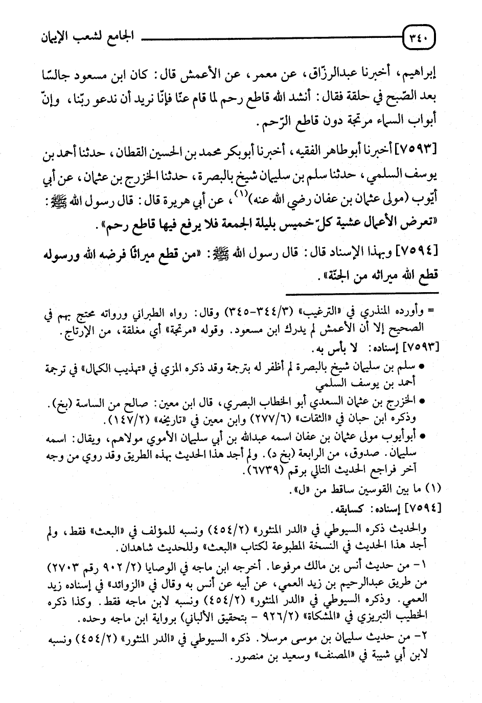 7593 - أَخْبَرَنَا أَبُو طَاهِرٍ الْفَقِيهُ، أنا أَبُو بَكْرٍ مُحَمَّدُ بْنُ الْحُسَيْنِ الْقَطَّانُ، نا أَحْمَدُ بْنُ يُوسُفَ السُّلَمِيُّ، نا سَالِمُ بْنُ شَيْخٍ، بِالْبَصْرَةِ، نا الْخَزْرَجُ بْنُ عُثْمَانَ، عَنْ أَبِي أَيُّوبَ، مَوْلَى عُثْمَانَ بْنِ عَفَّانَ، عَنْ أَبِي هُرَيْرَةَ، قَالَ: قَالَ رَسُولُ اللهِ صَلَّى اللَّهُ عَلَيْهِ وَسَلَّمَ: " §تُعْرَضُ الْأَعْمَالُ عَشِيَّةَ كُلِّ خَمِيسٍ لَيْلَةَ الْجُمُعَةِ، فَلَا يُرْفَعُ فِيهَا قَاطِعُ رَحِمٍ "