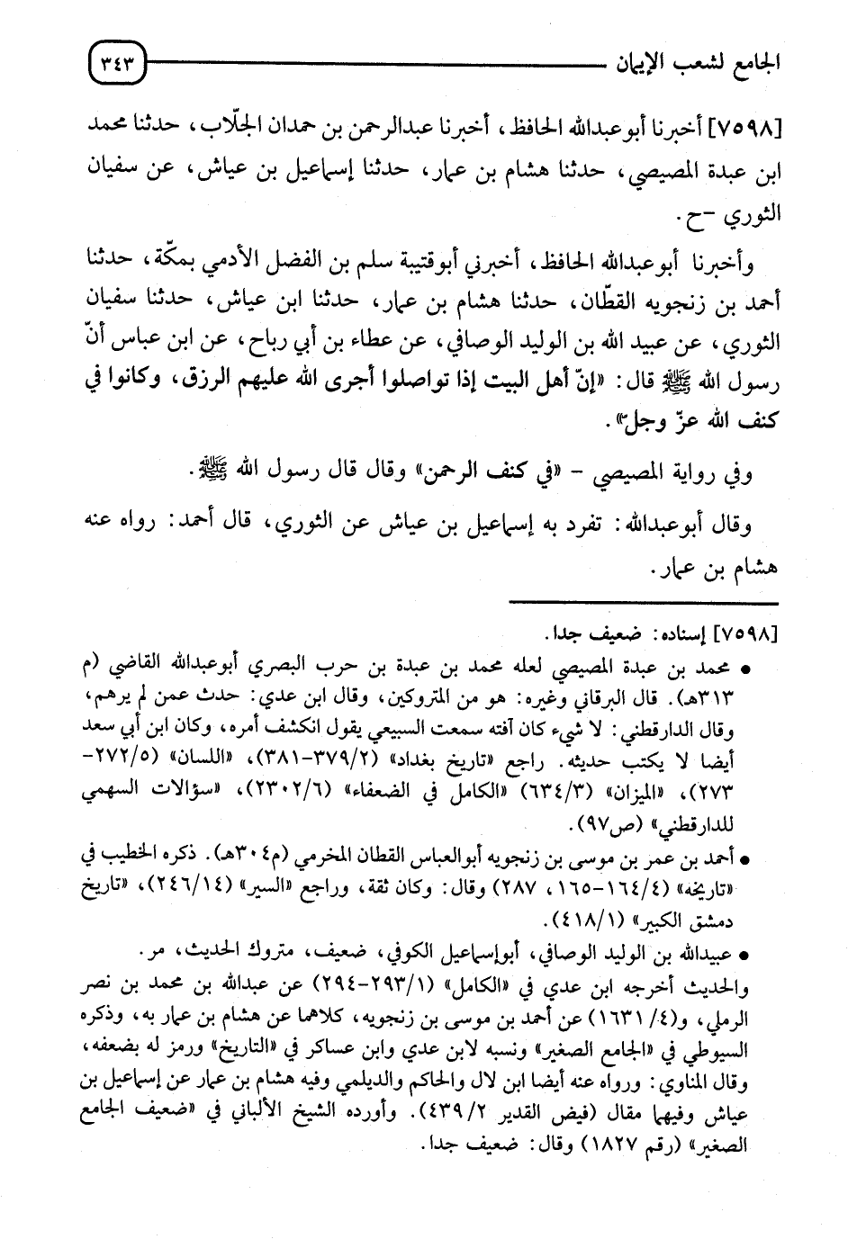 7598 - أَخْبَرَنَا أَبُو عَبْدِ اللهِ الْحَافِظُ، أنا عَبْدُ الرَّحْمَنِ بْنُ حَمْدَانَ الْجَلَّابُ، نا مُحَمَّدُ بْنُ عَبْدَةَ الْمِصِّيصِيُّ، نا هِشَامُ بْنُ عَمَّارٍ، نا إِسْمَاعِيلُ بْنُ عَيَّاشٍ، عَنْ سُفْيَانَ الثَّوْرِيِّ، وَأَخْبَرَنَا أَبُو عَبْدِ اللهِ الْحَافِظُ، أَخْبَرَنِي أَبُو قُتَيْبَةَ سَالِمُ بْنُ الْفَضْلِ الْآدَمِيُّ بِمَكَّةَ، ثَنَا أَبُو أَحْمَدَ بْنُ زَنْجَوَيْهِ، ثَنَا هِشَامُ بْنُ عَمَّارٍ، عَنِ ابْنِ عَيَّاشٍ، ثَنَا سُفْيَانُ الثَّوْرِيُّ، عَنْ عُبَيْدِ اللهِ بْنِ الْوَلِيدِ الْوَصَّافِيِّ، عَنْ عَطَاءِ بْنِ أَبِي رَبَاحٍ، عَنِ ابْنِ عَبَّاسٍ، أَنَّ رَسُولَ اللهِ صَلَّى اللَّهُ عَلَيْهِ وَسَلَّمَ، قَالَ: " إِنَّ §أَهْلَ الْبَيْتِ إِذَا تَوَاصَلُوا أُجْرِيَ عَلَيْهِمُ الرِّزْقُ، وَكَانُوا فِي كَنَفِ اللهِ عَزَّ وَجَلَّ " وَفِي رِوَايَةِ الْمِصِّيصِيِّ: " فِي كَفِّ الرَّحْمَنِ "، وَقَالَ: قَالَ رَسُولُ اللهِ صَلَّى اللَّهُ عَلَيْهِ وَسَلَّمَ، تَفَرَّدَ بِهِ إِسْمَاعِيلُ بْنُ عَيَّاشٍ، عَنِ الثَّوْرِيِّ، قَالَ أَحْمَدُ: " وَصَلَهُ عَنْهُ هِشَامُ بْنُ عَمَّارٍ "