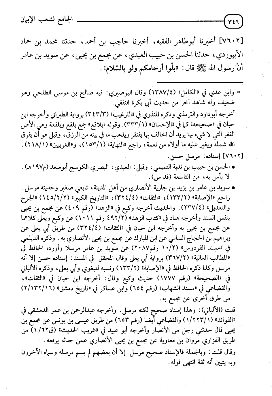 7602 - أَخْبَرَنَا أَبُو طَاهِرٍ الْفَقِيهُ، أنا حَاجِبُ بْنُ أَحْمَدَ، نا مُحَمَّدُ بْنُ حَمَّادٍ الْأَبْيُورْدِيُّ، نا الْحَسَنُ بْنُ حَبِيبٍ الْعَبْدِيُّ، عَنْ مُجَمِّعِ بْنِ يَحْيَى، عَنْ سُوَيْدِ بْنِ عَامِرٍ، أَنَّ رَسُولَ اللهِ صَلَّى اللَّهُ عَلَيْهِ وَسَلَّمَ قَالَ: " §بُلُّوا أَرْحَامَكُمْ وَلَوْ بِالسَّلَامِ " " -[347]- وَمَعْنَاهُ صِلُوا أَرْحَامَكُمْ، فَكَأَنَّهُ جَعَلَ وَصْلَ الرَّحِمِ لِتَسْكِينِ الْحَرَارَةِ بِالْمَاءِ، قَالَهُ الْحَلِيمِيُّ حِكَايَةً عَنْ غَيْرِهِ "