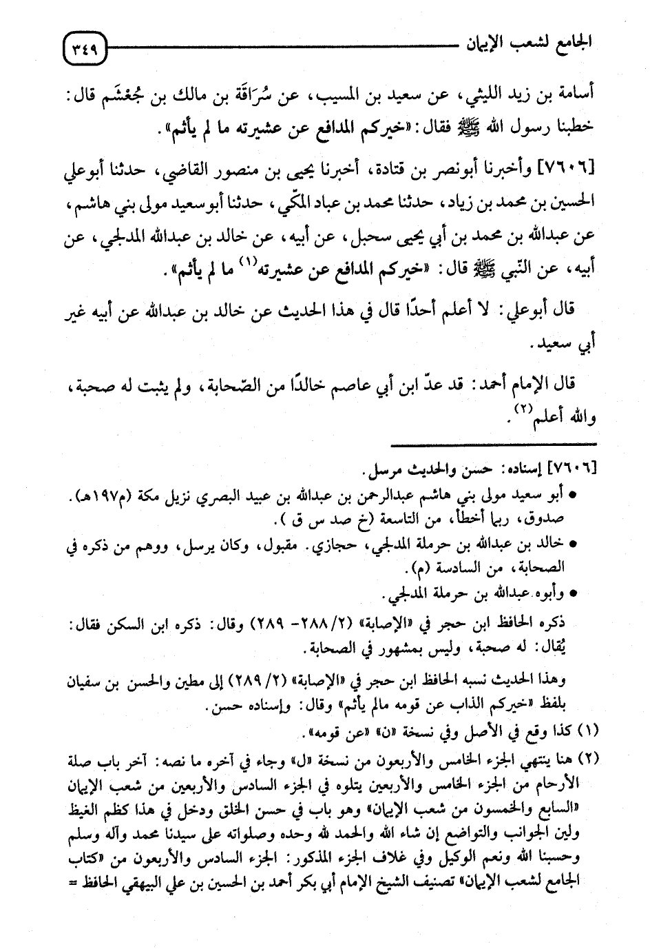 7606 - وَأَخْبَرَنَا أَبُو نَصْرِ بْنُ قَتَادَةَ، أنا يَحْيَى بْنُ مَنْصُورٍ الْقَاضِي، نا أَبُو عَلِيٍّ الْحُسَيْنُ بْنُ مُحَمَّدِ بْنِ زِيَادٍ، نا مُحَمَّدُ بْنُ عَبَّادٍ الْمَكِّيُّ، نا أَبُو سَعِيدٍ، مَوْلَى بَنِي هَاشِمٍ، عَنْ عَبْدِ اللهِ بْنِ مُحَمَّدِ بْنِ أَبِي يَحْيَى سَحْبَلٍ، عَنْ أَبِيهِ، عَنْ خَالِدِ بْنِ عَبْدِ اللهِ الْمُدْلِجِيِّ، عَنْ أَبِيهِ، عَنِ النَّبِيِّ صَلَّى اللَّهُ عَلَيْهِ وَسَلَّمَ قَالَ: §" خَيْرِكُمُ الْمُدَافِعُ عَنْ عَشِيرَتِهِ مَا لَمْ يَأْثَمْ " قَالَ أَبُو عَلِيٍّ: لَا أَعْلَمُ أَحَدًا قَالَ فِي هَذَا الْحَدِيثِ، عَنْ خَالِدِ بْنِ عَبْدِ اللهِ، عَنْ أَبِيهِ، عَنْ أَبِي سَعِيدٍ، قَالَ الْإِمَامُ أَحْمَدُ: " قَدْ عَدَّ ابْنُ أَبِي عَاصِمٍ خَالِدًا مِنَ الصَّحَابَةِ، وَلَمْ يَثْبُتْ لَهُ صُحْبَةٌ، وَاللهُ أَعْلَمُ "