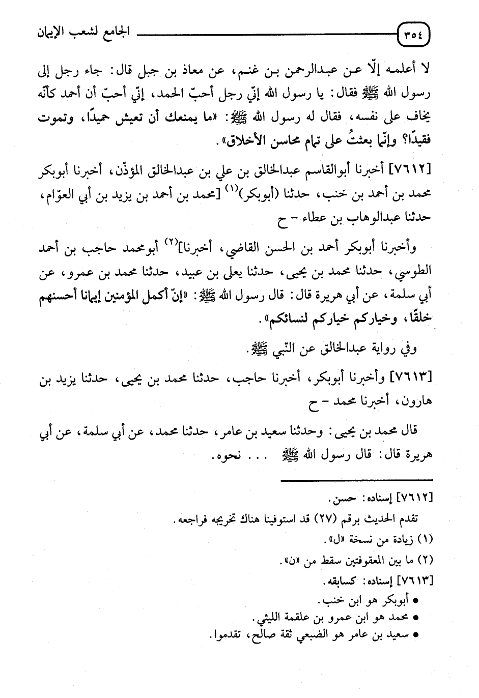 7612 - أَخْبَرَنَا أَبُو الْقَاسِمِ عَبْدُ الْخَالِقِ بْنُ عَلِيِّ بْنِ عَبْدِ الْخَالِقِ الْمُؤَذِّنُ، أَخْبَرَنَا أَبُو بَكْرٍ مُحَمَّدُ بْنُ أَحْمَدَ بْنِ خَنْبٍ، نا مُحَمَّدُ بْنُ أَحْمَدَ بْنِ يَزِيدَ بْنِ أَبِي الْعَوَّامِ، نا عَبْدُ الْوَهَّابِ بْنُ عَطَاءٍ، ح وَأَخْبَرَنَا أَبُو بَكْرٍ أَحْمَدُ بْنُ الْحَسَنِ الْقَاضِي، أنا أَبُو مُحَمَّدٍ حَاجِبُ بْنُ أَحْمَدَ الطُّوسِيُّ، نا مُحَمَّدُ بْنُ يَحْيَى، نا يَعْلَى بْنُ عُبَيْدٍ، نا مُحَمَّدُ بْنُ عَمْرٍو، عَنْ أَبِي سَلَمَةَ، عَنْ أَبِي هُرَيْرَةَ، قَالَ: قَالَ رَسُولُ اللهِ صَلَّى اللَّهُ عَلَيْهِ وَسَلَّمَ: " إِنَّ §أَكْمَلَ الْمُؤْمِنِينَ إِيمَانًا أَحْسَنُهُمْ خُلُقًا، وَخِيَارُكُمْ خِيَارُكُمْ لِنِسَائِكُمْ " وَفِي رِوَايَةِ عَبْدِ الْخَالِقِ، عَنِ النَّبِيِّ صَلَّى اللَّهُ عَلَيْهِ وَسَلَّمَ،