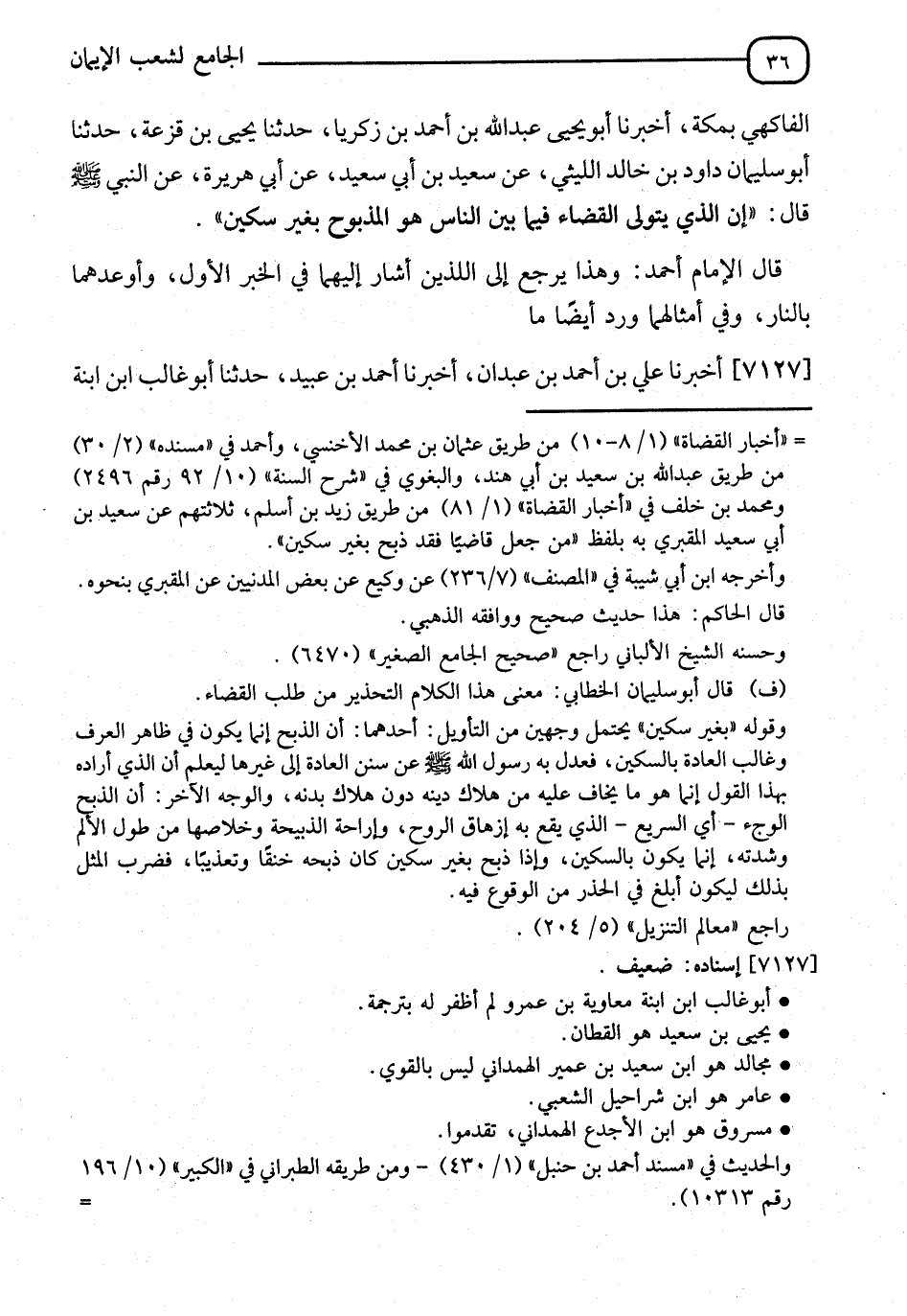 7127 - أَخْبَرَنَا عَلِيُّ بْنُ أَحْمَدَ بْنِ عَبْدَانَ، أنا أَحْمَدُ بْنُ عُبَيْدٍ، نا أَبُو غَالِبٍ ابْنُ ابْنَةِ -[37]- مُعَاوِيَةَ بْنِ عَمْرٍو، نا أَحْمَدُ بْنُ الْخَلِيلِ الشَّيْبَانِيُّ، وَنا سَنَةَ إِحْدَى وَأَرْبَعِينَ وَوُلِدَ سَنَةَ أَرْبَعٍ وَسِتِّينَ وَمِائَةٍ، حَدَّثَنَا يَحْيَى بْنُ سَعِيدٍ، حَدَّثَنِي مُجَالِدٌ، عَنْ عَامِرٍ، عَنْ مَسْرُوقٍ، عَنْ عَبْدِ اللهِ، قَالَ: قَالَ رَسُولُ اللهِ صَلَّى اللَّهُ عَلَيْهِ وَسَلَّمَ: §" مَا مِنْ حَاكِمٍ يَحْكُمُ بَيْنَ النَّاسِ إِلَّا حُشِرَ يَوْمَ الْقِيَامَةِ، وَمَلَكٌ آخِذٌ بِقَفَاهُ حَتَّى يَقِفَ عَلَى جَهَنَّمَ، ثُمَّ يُرْجِعَ رَأْسَهُ إِلَى اللهِ عَزَّ وَجَلَّ فَإِذَا قَالَ: أَلْقِهِ أَلْقَاهُ فَأَهْوَى أَرْبَعِينَ خَرِيفًا "