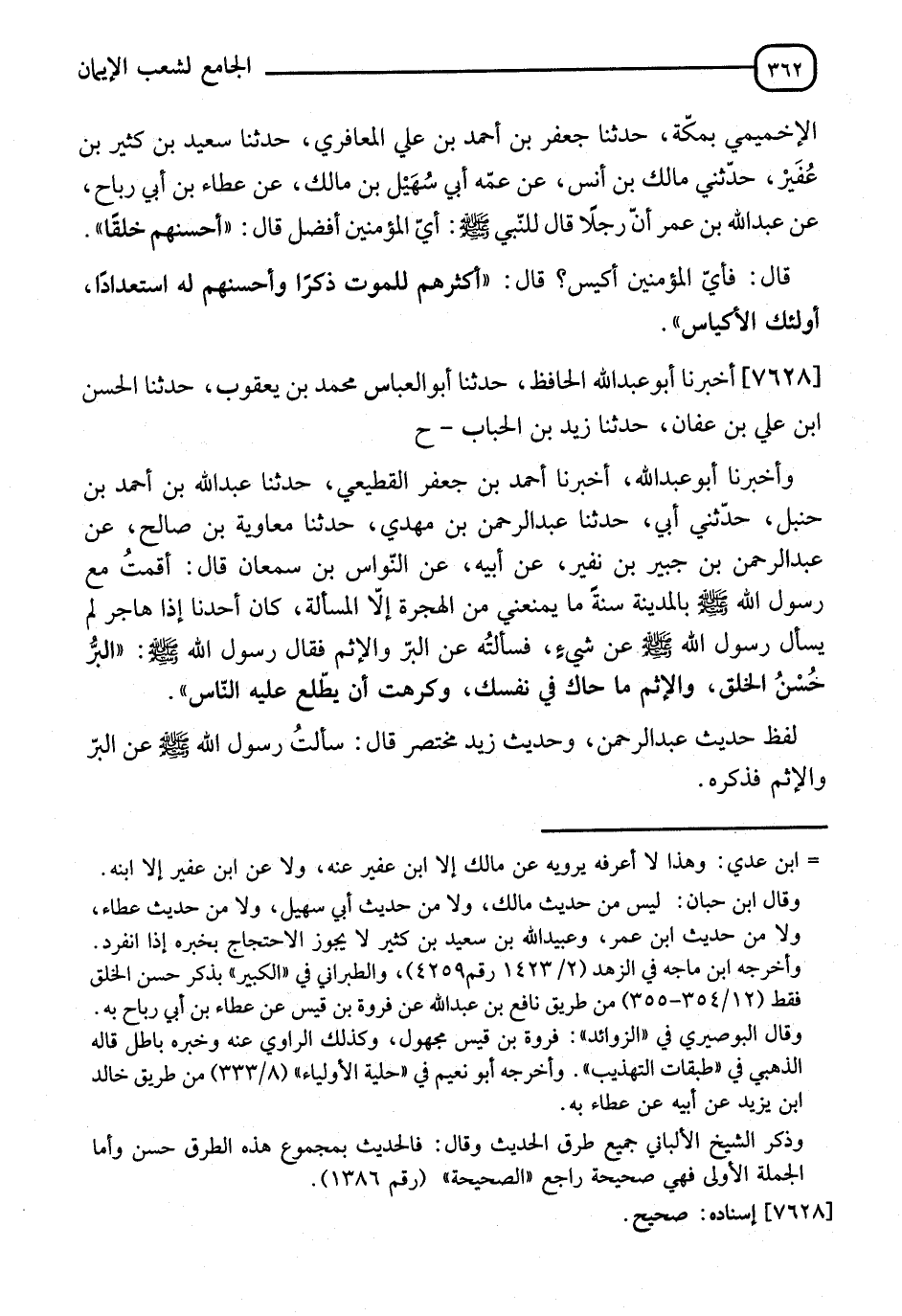 7628 - أَخْبَرَنَا أَبُو عَبْدِ اللهِ الْحَافِظُ، نا أَبُو الْعَبَّاسِ مُحَمَّدُ بْنُ يَعْقُوبَ، نا الْحَسَنُ بْنُ عَلِيِّ بْنِ عَفَّانَ، نا زَيْدُ بْنُ الْحُبَابِ، ح وَأَخْبَرَنَا أَبُو عَبْدِ اللهِ، أنا أَحْمَدُ بْنُ جَعْفَرٍ الْقُطَيْعِيُّ، نا عَبْدُ اللهِ بْنُ أَحْمَدَ بْنِ حَنْبَلٍ، حَدَّثَنِي أَبِي، نا عَبْدُ الرَّحْمَنِ بْنُ مَهْدِيٍّ، نا مُعَاوِيَةُ بْنُ صَالِحٍ، عَنْ عَبْدِ الرَّحْمَنِ بْنِ جُبَيْرِ بْنِ نُفَيْرٍ، عَنْ أَبِيهِ، عَنِ النَّوَّاسِ بْنِ سَمْعَانَ، قَالَ: أَقَمْتُ مَعَ رَسُولِ اللهِ صَلَّى اللَّهُ عَلَيْهِ وَسَلَّمَ بِالْمَدِينَةِ سَنَةً مَا يَمْنَعُنِي مِنَ الْهِجْرَةِ إِلَّا الْمَسْأَلَةُ، كَانَ أَحَدُنَا إِذَا هَاجَرَ لَمْ يَسْأَلْ رَسُولَ اللهِ صَلَّى اللَّهُ عَلَيْهِ وَسَلَّمَ عَنْ شَيْءٍ، فَسَأَلْتُهُ عَنِ الْبِرِّ، وَالْإِثْمِ، فَقَالَ رَسُولُ اللهِ صَلَّى اللَّهُ عَلَيْهِ وَسَلَّمَ: " §الْبِرُّ حُسْنُ الْخُلُقِ، وَالْإِثْمُ مَا حَاكَ فِي نَفْسِكَ، وَكَرِهْتَ أَنْ يَطَّلِعَ عَلَيْهِ النَّاسُ " لَفْظُ حَدِيثِ عَبْدِ الرَّحْمَنِ، وَحَدِيثُ زَيْدٍ مُخْتَصَرٌ، قَالَ: سَأَلْتُ رَسُولَ اللهِ صَلَّى اللَّهُ عَلَيْهِ وَسَلَّمَ عَنِ الْبِرِّ، وَالْإِثْمِ فَذَكَرَهُ، -[363]- رَوَاهُ مُسْلِمٌ فِي الصَّحِيحِ، عَنْ مُحَمَّدِ بْنِ حَاتِمٍ، عَنْ عَبْدِ الرَّحْمَنِ بْنِ مَهْدِيٍّ
