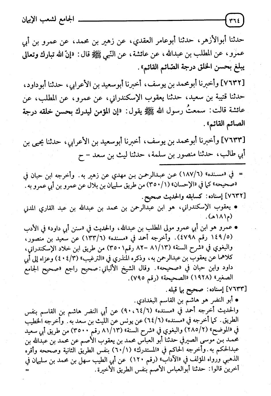 7633 - وَأَخْبَرَنَا أَبُو مُحَمَّدِ بْنُ يُوسُفَ، أنا سَعِيدُ بْنُ الْأَعْرَابِيِّ، نا يَحْيَى بْنُ أَبِي طَالِبٍ، نا مَنْصُورُ بْنُ سَلَمَةَ، نا لَيْثُ بْنُ سَعْدٍ، ح -[365]- وَأَخْبَرَنَا أَبُو عَبْدِ اللهِ، نا أَبُو الْعَبَّاسِ الْأَصَمُّ، نا الْعَبَّاسُ بْنُ مُحَمَّدٍ الدُّورِيُّ، نا أَبُو النَّضْرِ، نا اللَّيْثُ بْنُ سَعْدٍ، ح وَأَخْبَرَنَا أَبُو الطَّيِّبِ سَهْلُ بْنُ مُحَمَّدٍ فِي آخَرِينَ، قَالُوا: نا أَبُو الْعَبَّاسِ، نا مُحَمَّدُ بْنُ عَبْدِ اللهِ بْنِ عَبْدِ الْحَكَمِ، أنا أَبِي، وَشُعَيْبُ بْنُ اللَّيْثِ، قَالَا: أنا اللَّيْثُ بْنُ سَعْدٍ، عَنْ يَزِيدَ بْنِ عَبْدِ اللهِ بْنِ الْهَادِ، عَنْ عَمْرِو بْنِ أَبِي عَمْرٍو، عَنِ الْمُطَّلِبِ، عَنْ عَائِشَةَ، قَالَتْ: قَالَ رَسُولُ اللهِ صَلَّى اللَّهُ عَلَيْهِ وَسَلَّمَ: " إِنَّ §الرَّجُلَ لَيُدْرِكُ بِحُسْنِ خُلُقِهِ دَرَجَاتِ قَائِمِ اللَّيْلِ صَائِمِ النَّهَارِ " لَفْظُ حَدِيثِ أَبِي عَبْدِ اللهِ. وَفِي رِوَايَةِ الْإِمَامِ: سَمِعْتُ رَسُولَ اللهِ صَلَّى اللَّهُ عَلَيْهِ وَسَلَّمَ يَقُولُ: " إِنَّ الْمُؤْمِنَ لَيَسْتَدْرِكُ بِحُسْنِ خُلُقِهِ دَرَجَةَ قَائِمِ اللَّيْلِ صَائِمِ النَّهَارِ "، وَقَالَ فِي إِسْنَادِهِ: عَنِ ابْنِ الْهَادِ، عَنْ عَمْرِو بْنِ أَبِي عَمْرٍو، عَنِ عَبْدِ الْمُطَّلِبِ بْنِ عَبْدِ اللهِ