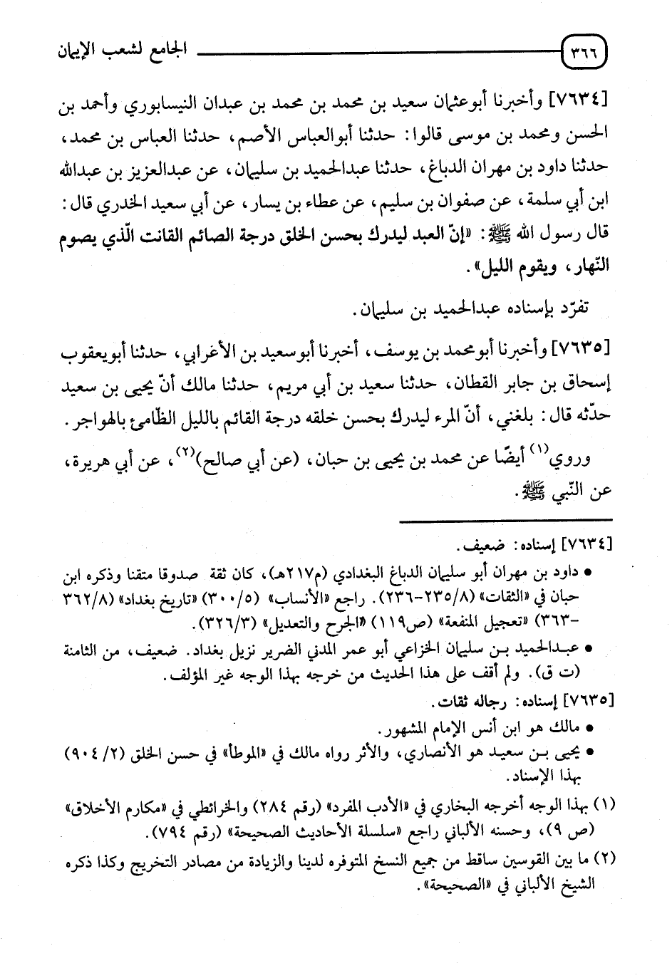 7635 - وَأَخْبَرَنَا أَبُو مُحَمَّدِ بْنُ يُوسُفَ، أنا أَبُو سَعِيدِ بْنُ الْأَعْرَابِيِّ، نا أَبُو يَعْقُوبَ إِسْحَاقُ بْنُ جَابِرٍ الْقَطَّانُ، نا سَعِيدُ بْنُ أَبِي مَرْيَمَ، نا مَالِكٌ، أَنَّ يَحْيَى بْنَ سَعِيدٍ، حَدَّثَهُ قَالَ: بَلَغَنِي أَنَّ §" الْمَرْءَ لَيُدْرِكُ بِحُسْنِ خُلُقِهِ دَرَجَةَ الْقَائِمِ بِاللَّيْلِ الظَّامِي بِالْهَوَاجِرِ " وَرُوِيَ أَيْضًا عَنْ مُحَمَّدِ بْنِ يَحْيَى بْنِ حَبَّانَ، عَنْ أَبِي هُرَيْرَةَ، عَنِ النَّبِيِّ صَلَّى اللَّهُ عَلَيْهِ وَسَلَّمَ