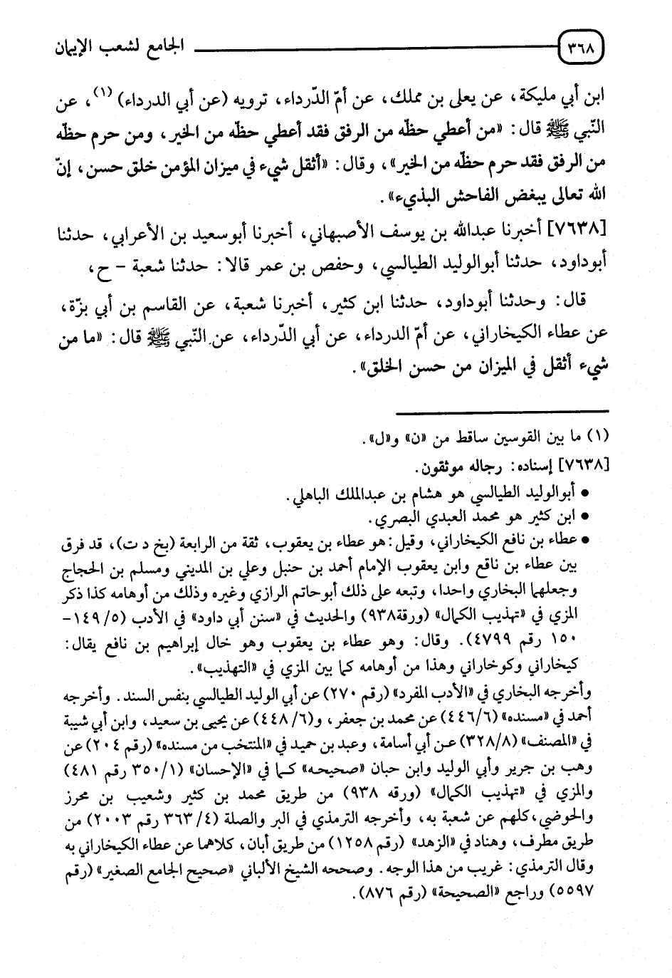 7638 - أَخْبَرَنَا عَبْدُ اللهِ بْنُ يُوسُفَ الْأَصْبَهَانِيُّ، أنا أَبُو سَعِيدِ بْنُ الْأَعْرَابِيِّ، نا أَبُو دَاوُدَ، نا أَبُو الْوَلِيدِ الطَّيَالِسِيُّ، وَحَفْصُ بْنُ عُمَرَ، قَالَا: نا شُعْبَةُ، ح قَالَ: وَنا أَبُو دَاوُدَ، نا ابْنُ كَثِيرٍ، أنا شُعْبَةُ، عَنِ الْقَاسِمِ بْنِ أَبِي بُرَّةَ، عَنْ عَطَاءٍ الْكَيْخَارَانِيِّ، عَنْ أُمِّ الدَّرْدَاءِ، عَنْ أَبِي الدَّرْدَاءِ، عَنِ النَّبِيِّ صَلَّى اللَّهُ عَلَيْهِ وَسَلَّمَ قَالَ: §" مَا مِنْ شَيْءٍ أَثْقَلَ فِي الْمِيزَانِ مِنْ حُسْنِ الْخُلُقِ " -[369]-
