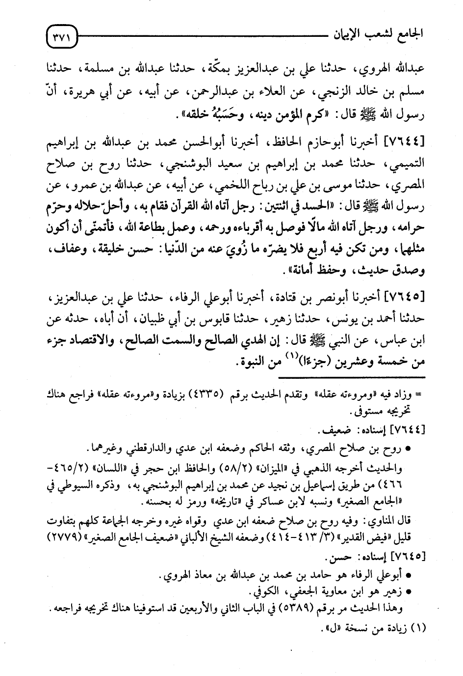 7644 - أَخْبَرَنَا أَبُو حَازِمٍ الْحَافِظُ، أنا أَبُو الْحَسَنِ مُحَمَّدُ بْنُ عَبْدِ اللهِ بْنِ إِبْرَاهِيمَ التَّمِيمِيُّ، نا مُحَمَّدُ بْنُ إِبْرَاهِيمَ بْنِ سَعِيدٍ الْبُوشَنْجِيُّ، نا رَوْحُ بْنُ صَلَاحٍ الْمِصْرِيُّ، نا مُوسَى بْنُ عَلِيِّ بْنِ رَبَاحٍ اللَّخْمِيُّ، عَنْ أَبِيهِ، عَنْ عَبْدِ اللهِ بْنِ عَمْرٍو، عَنْ رَسُولِ اللهِ صَلَّى اللَّهُ عَلَيْهِ وَسَلَّمَ قَالَ: " §الْحَسَدُ فِي اثْنَتَيْنِ: رَجُلٍ آتَاهُ اللهُ الْقُرْآنَ فَقَامَ بِهِ، وَأَحَلَّ حَلَالَهُ، وَحَرَّمَ حَرَامَهُ، وَرَجُلٍ آتَاهُ اللهُ مَالًا فَوَصَلَ بِهِ أَقْرِبَاءَهُ وَرَحِمَهُ، وَعَمَلَ بِطَاعَةِ اللهِ، فَيَتَمَنَّى أَنْ يَكُونَ مِثْلَهُمَا، وَمَنْ يَكُنْ فِيهِ أَرْبَعٌ فَلَا يَضُرُّهُ مَا زُوِيَ عَنْهُ مِنَ الدُّنْيَا: حُسْنُ خَلِيقَةٍ، وَعَفَافٌ، وَصِدْقُ حَدِيثٍ، وَحِفْظُ أَمَانَةٍ "