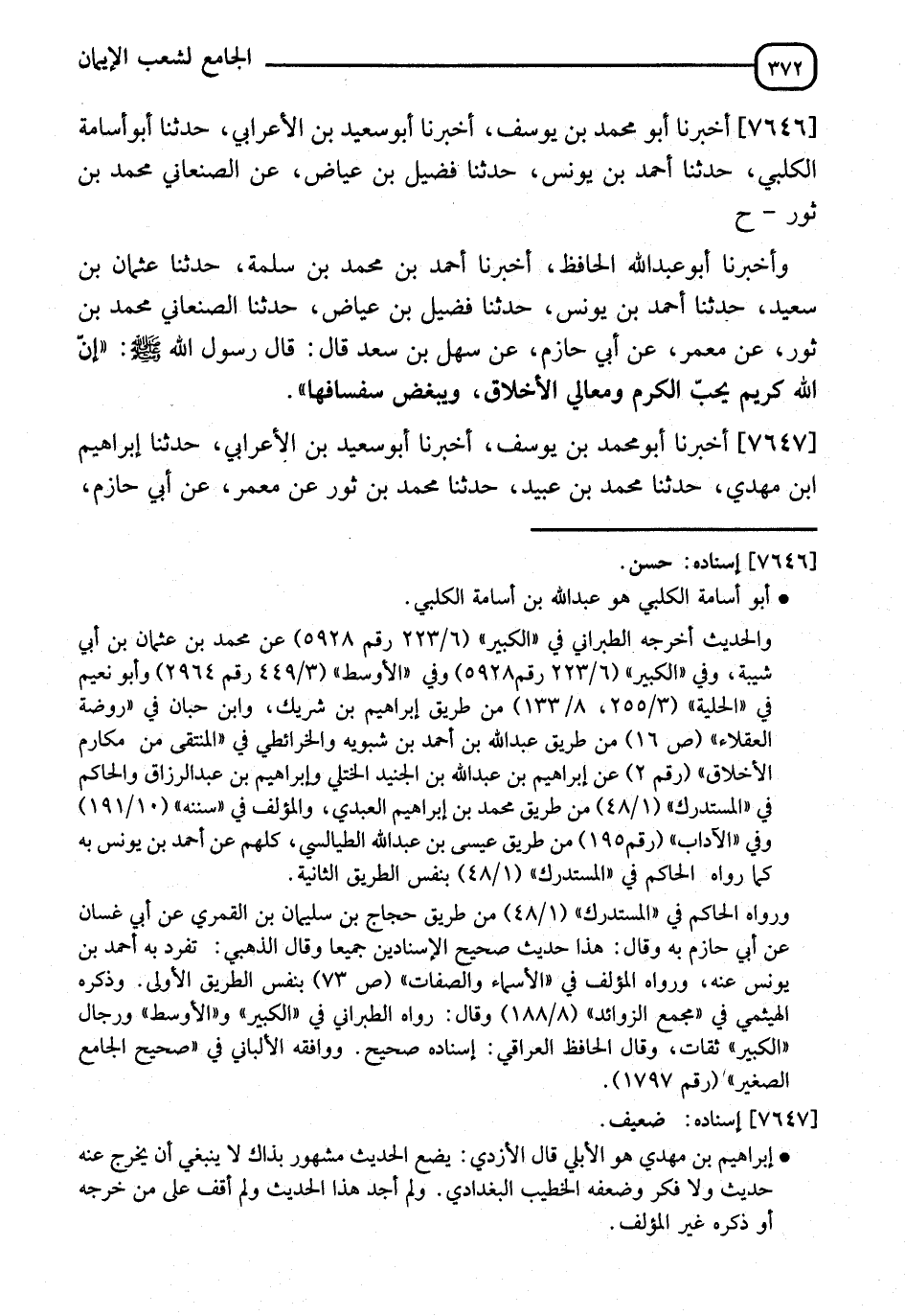 7646 - أَخْبَرَنَا أَبُو مُحَمَّدِ بْنُ يُوسُفَ، أنا أَبُو سَعِيدِ بْنُ الْأَعْرَابِيِّ، نا أَبُو أُسَامَةَ الْكَلْبِيُّ، نا أَحْمَدُ بْنُ يُونُسَ، نا فُضَيْلُ بْنُ عِيَاضٍ، عَنِ الصَّنْعَانِيِّ مُحَمَّدِ بْنِ ثَوْرٍ، وَأَخْبَرَنَا أَبُو عَبْدِ اللهِ الْحَافِظُ، أنا أَحْمَدُ بْنُ مُحَمَّدِ بْنِ سَلَمَةَ، نا عُثْمَانُ بْنُ سَعِيدٍ، نا أَحْمَدُ بْنُ يُونُسَ، نا فُضَيْلُ بْنُ عِيَاضٍ، نا الصَّنْعَانِيُّ مُحَمَّدُ بْنُ ثَوْرٍ، عَنْ مَعْمَرٍ، عَنْ أَبِي حَازِمٍ، عَنْ سَهْلِ بْنِ سَعْدٍ، قَالَ: قَالَ رَسُولُ اللهِ صَلَّى اللَّهُ عَلَيْهِ وَسَلَّمَ: " إِنَّ §اللهَ كَرِيمٌ يُحِبُّ الْكَرَمَ وَمَعَالِيَ الْأَخْلَاقِ، وَيُبْغِضُ سَفْسَافَهَا "