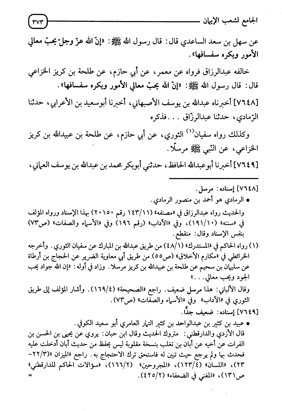 7649 - أَخْبَرَنَا أَبُو عَبْدِ اللهِ الْحَافِظُ، حَدَّثَنِي أَبُو بَكْرٍ مُحَمَّدُ بْنُ عَبْدِ اللهِ بْنِ يُوسُفَ الْعُمَانِيُّ، -[374]- نا أَبُو سَعِيدٍ عُبَيْدُ بْنُ عَبْدِ الْوَاحِدِ الْكُوفِيُّ، نا ضِرَارُ بْنُ صُرَدَ، نا عَاصِمُ بْنُ حُمَيْدٍ، عَنْ أَبِي حَمْزَةَ وَهُوَ الثُّمَالِيُّ، عَنْ عَبْدِ الرَّحْمَنِ بْنِ جُبَيْرٍ، عَنْ كُمَيْلِ بْنِ زِيَادٍ النَّخَعِيِّ، قَالَ: قَالَ عَلِيُّ بْنُ أَبِي طَالِبٍ: يَا سُبْحَانَ اللهِ، مَا أَزْهَدَ كَثِيرًا مِنَ النَّاسِ فِي خَيْرٍ عَجَبًا لِرَجُلٍ يَجِيئُهُ أَخُوهُ الْمُسْلِمُ فِي الْحَاجَةِ فَلَا يَرَى نَفْسَهُ لِلْخَيْرِ أَهْلًا، فَلَوْ كَانَ لَا يَرْجُو ثَوَابًا، وَلَا يَخْشَى عِقَابًا لَكَانَ يَنْبَغِي لَهُ أَنْ يُسَارِعَ فِي مَكَارِمِ الْأَخْلَاقِ، فَإِنَّهَا تَدُلُّ عَلَى سَبِيلِ النَّجَاحِ، فَقَامَ إِلَيْهِ رَجُلٌ فَقَالَ: فِدَاكَ أَبِي وَأُمِّي يَا أَمِيرَ الْمُؤْمِنِينَ، أَسَمِعْتَ مِنْ رَسُولِ اللهِ صَلَّى اللَّهُ عَلَيْهِ وَسَلَّمَ؟ قَالَ: نَعَمْ، وَمَا هُوَ خَيْرٌ، فَذَكَرَ حَدِيثًا فِي قُدُومِ ابْنَةِ حَاتِمٍ الطَّائِيِّ، وَذِكْرِهَا أَخْلَاقَ أَبِيهَا، وَأَنَّهُ لَمْ يَرُدَّ طَالِبَ حَاجَةٍ قَطُّ، وَذَكَرْنَاهَا فِي كِتَابِ دَلَائِلِ النُّبُوَّةِ، قَالَ: فَقَالَ النَّبِيُّ صَلَّى اللَّهُ عَلَيْهِ وَسَلَّمَ: " خَلُّوا عَنْهَا، فَإِنَّ أَبَاهَا كَانَ يُحِبُّ مَكَارِمَ الْأَخْلَاقِ، وَاللهُ يُحِبُّ مَكَارِمَ الْأَخْلَاقِ " فَقَامَ أَبُو بُرْدَةَ بْنُ نِيَادٍ فَقَالَ: يَا رَسُولَ اللهِ، اللهُ عَزَّ وَجَلَّ يُحِبُّ مَكَارِمَ الْأَخْلَاقِ؟ فَقَالَ رَسُولُ اللهِ صَلَّى اللَّهُ عَلَيْهِ وَسَلَّمَ: " وَالَّذِي نَفْسِي بِيَدِهِ §لَا يَدْخُلُ الْجَنَّةَ أَحَدٌ إِلَّا بِحُسْنِ الْخُلُقِ "
