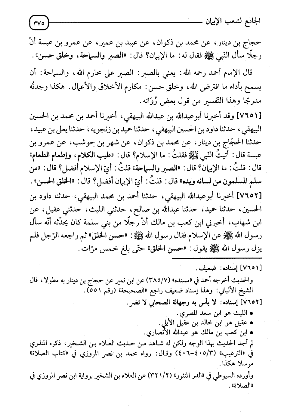 7651 - أَخْبَرَنَا أَبُو عَبْدِ اللهِ بْنُ عَبْدِ اللهِ الْبَيْهَقِيُّ، أنا أَحْمَدُ بْنُ مُحَمَّدِ بْنِ الْحُسَيْنِ الْبَيْهَقِيُّ، نا دَاوُدُ بْنُ الْحُسَيْنِ الْبَيْهَقِيُّ، نا حُمَيْدُ بْنُ زَنْجَوَيْهِ، نا يَعْلَى بْنُ عُبَيْدٍ، نا الْحَجَّاجُ بْنُ دِينَارٍ، عَنْ مُحَمَّدِ بْنِ ذَكْوَانَ، عَنْ شَهْرِ بْنِ حَوْشَبٍ، عَنْ عَمْرِو بْنِ عَنْبَسَةَ، قَالَ: أَتَيْتُ النَّبِيَّ صَلَّى اللَّهُ عَلَيْهِ وَسَلَّمَ فَقُلْتُ: مَا §الْإِسْلَامُ؟ قَالَ: " طِيبُ الْكَلَامِ، وَإِطْعَامُ الطَّعَامِ " قَالَ: قُلْتُ: مَا الْإِيمَانُ؟ قَالَ: " الصَّبْرُ وَالسَّمَاحَةُ "، قُلْتُ: أَيُّ الْإِسْلَامِ أَفْضَلُ؟ قَالَ: " مَنْ سَلِمَ الْمُسْلِمُونَ مِنْ لِسَانِهِ وَيَدِهِ " قَالَ: قُلْتُ: أَيُّ الْإِيمَانِ أَفْضَلُ؟ قَالَ: " الْخُلُقُ الْحَسَنُ "