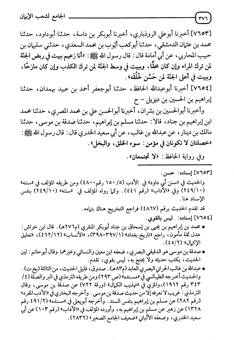 7653 - أَخْبَرَنَا أَبُو عَلِيٍّ الرُّوذْبَارِيُّ، أنا أَبُو بَكْرِ بْنُ دَاسَةَ، نا أَبُو دَاوُدَ، نا مُحَمَّدُ بْنُ عُثْمَانَ الدِّمَشْقِيُّ، نا أَبُو كَعْبٍ أَيُّوبُ بْنُ مُحَمَّدٍ السَّعْدِيُّ، حَدَّثَنِي سُلَيْمَانُ بْنُ حَبِيبٍ الْمُحَارِبِيُّ، عَنْ أَبِي أُمَامَةَ، قَالَ: قَالَ رَسُولُ اللهِ صَلَّى اللَّهُ عَلَيْهِ وَسَلَّمَ: §" أَنَا زَعِيمُ بِبَيْتٍ بِرَبَضِ الْجَنَّةِ لِمَنْ تَرَكَ الْمِرَاءَ، وَإِنْ كَانَ مُحِقًّا، وَبِبَيْتٍ فِي وَسَطِ الْجَنَّةِ لِمَنْ تَرَكَ الْكَذِبَ، وَإِنْ كَانَ مَازِحًا، وَبِبَيْتٍ فِي أَعَلَى الْجَنَّةِ لِمَنْ حُسُنَ خُلُقُهُ "