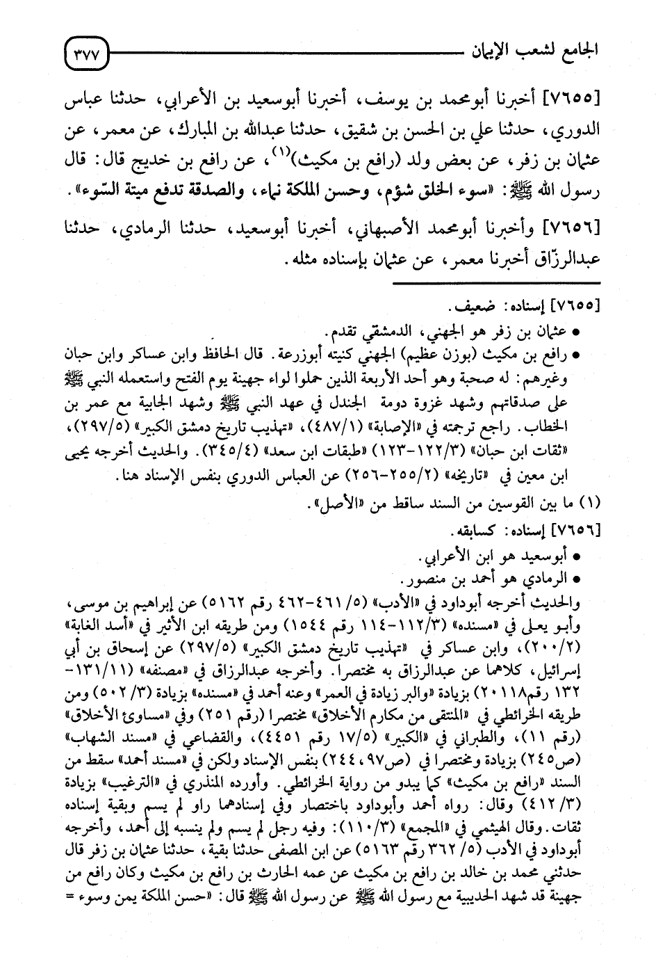 7655 - أَخْبَرَنَا أَبُو مُحَمَّدِ بْنُ يُوسُفَ، أنا أَبُو سَعِيدِ بْنُ الْأَعْرَابِيِّ، نا عَبَّاسٌ الدُّورِيُّ، نا عَلِيُّ بْنُ الْحَسَنِ بْنِ شَقِيقٍ، نا عَبْدُ اللهِ بْنُ الْمُبَارَكِ، عَنْ مَعْمَرٍ، عَنْ عُثْمَانَ بْنِ زُفَرَ، عَنْ بَعْضِ وَلَدِ رَافِعِ بْنِ مَكِيثٍ، قَالَ: قَالَ رَسُولُ اللهِ صَلَّى اللَّهُ عَلَيْهِ وَسَلَّمَ: " §سُوءُ الْخُلُقِ شُؤْمٌ، وَحُسْنُ الْمَلَكَةِ نَمَاءٌ، وَالصَّدَقَةُ تَدْفَعُ مِيتَةَ السُّوءِ "