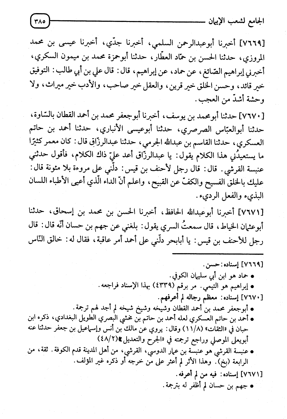 7670 - حَدَّثَنَا أَبُو مُحَمَّدِ بْنُ يُوسُفَ، أنا أَبُو جَعْفَرٍ مُحَمَّدُ بْنُ أَحْمَدَ الْقَطَّانُ بِالسَّاوَةِ، نا أَبُو الْعَبَّاسِ الصَّرْصَرِيُّ، نا أَبُو عِيسَى الْأَنْبَارِيُّ، نا أَبُو حَاتِمٍ الْعَسْكَرِيُّ، نا الْقَاسِمُ بْنُ عَبْدِ اللهِ الْجَرْمِيُّ، نا عَبْدُ الرَّزَّاقِ، قَالَ: كَانَ مَعْمَرٌ كَثِيرًا مَا يَسْتَعِيدُنِي فِي هَذَا الْكَلَامِ، يَقُولُ: يَا عَبْدَ الرَّزَّاقِ، أَعِدْ عَلَيَّ ذَلِكَ الْكَلَامَ، فَأَقُولَ: حَدَّثَنِي عَنْبَسَةُ الْقُرَشِيُّ، قَالَ: قَالَ رَجُلٌ لِأَحْنَفَ بْنِ قَيْسٍ: دُلَّنِي عَلَى مُرُؤَةٍ بِلَا مَؤُونَةٍ، قَالَ: " §عَلَيْكَ بِالْخُلُقِ الْفَسيِحِ، وَالْكَفِّ عَنِ الْقَبِيحِ، وَاعْلَمْ أَنَّ الدَّاءَ الَّذِي أَعْيَا الْأَطِبَّاءَ اللِّسَانُ الْبَذِيءُ، وَالْفِعْلُ الرَّدِيءُ "