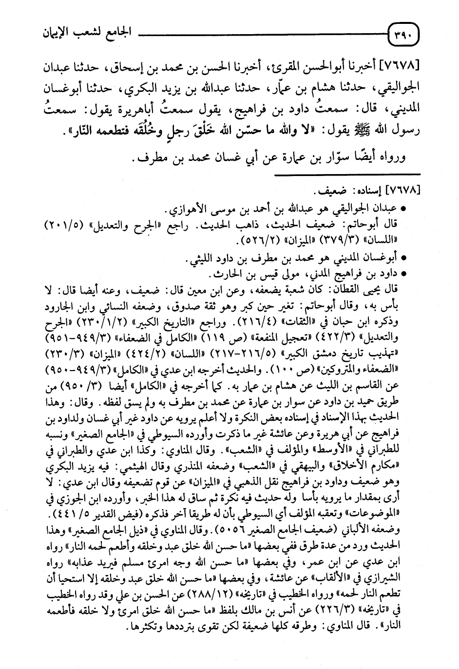 7678 - أَخْبَرَنَا أَبُو الْحَسَنِ الْمُقْرِئُ، أنا الْحَسَنُ بْنُ مُحَمَّدِ بْنِ إِسْحَاقَ، نا عَبْدَانُ الْجَوَالِيقِيُّ، نا هِشَامُ بْنُ عَمَّارٍ، نا عَبْدُ اللهِ بْنُ يَزِيدَ الْبَكْرِيُّ، نا أَبُو غَسَّانَ الْمِسْمَعِيُّ، قَالَ: سَمِعْتُ دَاوُدَ بْنَ فَرَاهِيجَ، يَقُولُ: سَمِعْتُ أَبَا هُرَيْرَةَ، يَقُولُ: سَمِعْتُ رَسُولَ اللهِ صَلَّى اللَّهُ عَلَيْهِ وَسَلَّمَ يَقُولُ: " لَا وَاللهِ، §مَا حَسَّنَ اللهُ خُلُقَ رَجُلٍ وَخَلْقَهُ فَتَطْعَمَهُ النَّارُ " وَرَوَاهُ أَيْضًا سَوَّارُ بْنُ عُمَارَةَ، عَنْ أَبِي غَسَّانَ مُحَمَّدِ بْنِ مُطَرِّفٍ