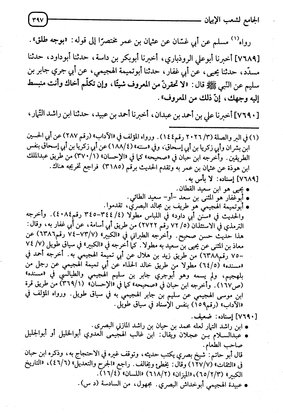 7689 - أَخْبَرَنَا أَبُو عَلِيٍّ الرُّوذْبَارِيُّ، أنا أَبُو بَكْرِ بْنُ دَاسَةَ، نا أَبُو دَاوُدَ، نا مُسَدَّدٌ، نا يَحْيَى، عَنِ أَبِي غِفَارٍ، نا أَبُو تَمِيمَةَ الْهُجَيْمِيُّ، عَنْ أَبِي جُرَيٍّ جَابِرِ بْنِ سُلَيْمٍ، عَنِ النَّبِيِّ صَلَّى اللَّهُ عَلَيْهِ وَسَلَّمَ، قَالَ: " §لَا تَحْقِرَنَّ مِنَ الْمَعْرُوفِ شَيْئًا، وَأَنْ تُكَلِّمَ أَخَاكَ وَأَنْتَ مُنْبَسِطٌ إِلَيْهِ وَجْهُكَ، وَأَنْ ذَلِكَ مِنَ الْمَعْرُوفِ "