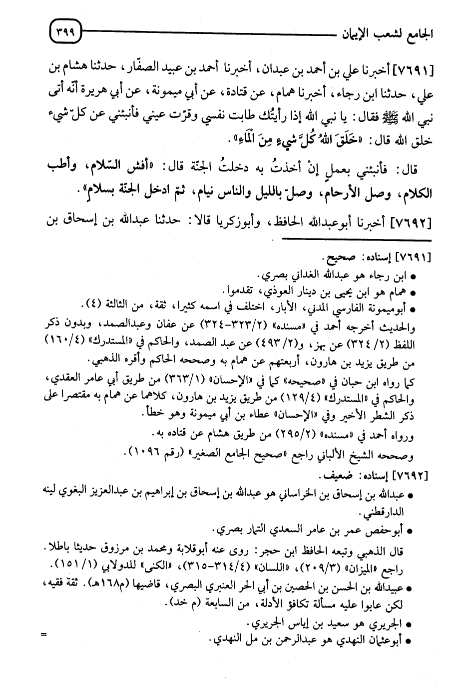7691 - أَخْبَرَنَا عَلِيُّ بْنُ أَحْمَدَ بْنِ عَبْدَانَ، أنا أَحْمَدُ بْنُ عُبَيْدٍ الصَّفَّارُ، نا هِشَامُ بْنُ عَلِيٍّ، نا رَجَا، أنا هَمَّامٌ، عَنْ أَبِي قَتَادَةَ، عَنْ أَبِي مَيْمُونَةَ، عَنْ أَبِي هُرَيْرَةَ، أَنْهُ أَتَى نَبِيَّ اللهِ صَلَّى اللَّهُ عَلَيْهِ وَسَلَّمَ، فَقَالَ: يَا نَبِيَّ اللهِ، إِذَا رَأَيْتُكَ طَابَتْ نَفْسِي وَقَرَّتْ عَيْنِي، فَأَنْبِئْنِي عَنْ كُلِّ شَيْءٍ خَلَقَ اللهُ، قَالَ: §" خَلَقَ اللهُ كُلَّ شَيْءٍ مِنَ الْمَاءِ "