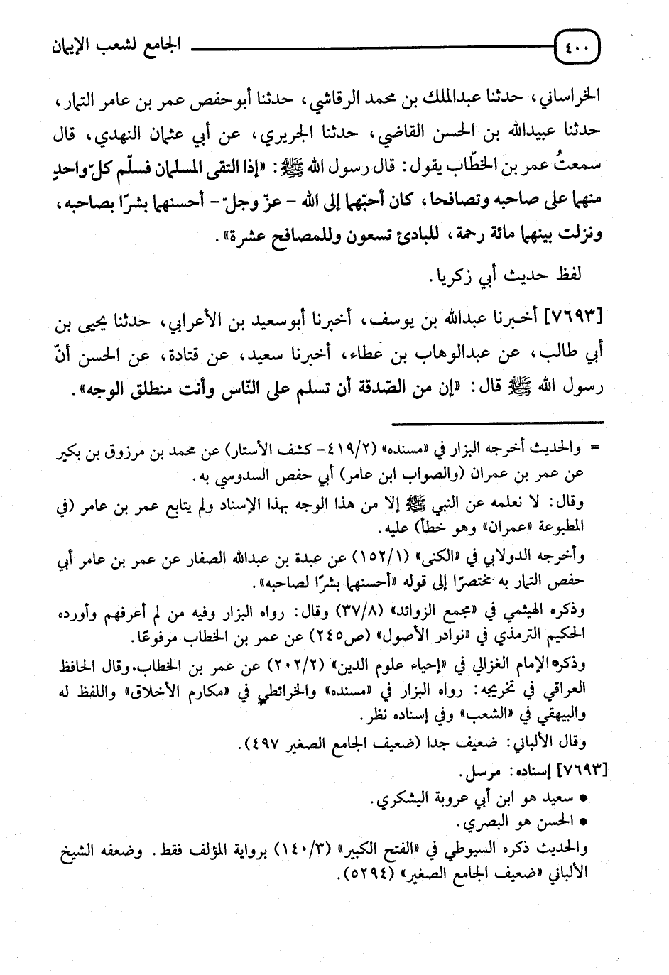 7693 - أَخْبَرَنَا عَبْدُ اللهِ بْنُ يُوسُفَ، أنا أَبُو سَعِيدِ بْنُ الْأَعْرَابِيِّ، نا يَحْيَى بْنُ أَبِي طَالِبٍ، عَنْ عَبْدِ الْوَهَّابِ بْنِ عَطَاءٍ، أنا سَعِيدٌ، عَنْ قَتَادَةَ، عَنِ الْحَسَنِ، أَنْ رَسُولَ اللهِ صَلَّى اللَّهُ عَلَيْهِ وَسَلَّمَ، قَالَ: " إِنَّ §مِنَ الصَّدَقَةِ أَنْ تُسَلِّمَ عَلَى النَّاسِ، وَأَنْتَ مُنْطَلِقُ الْوَجْهِ "