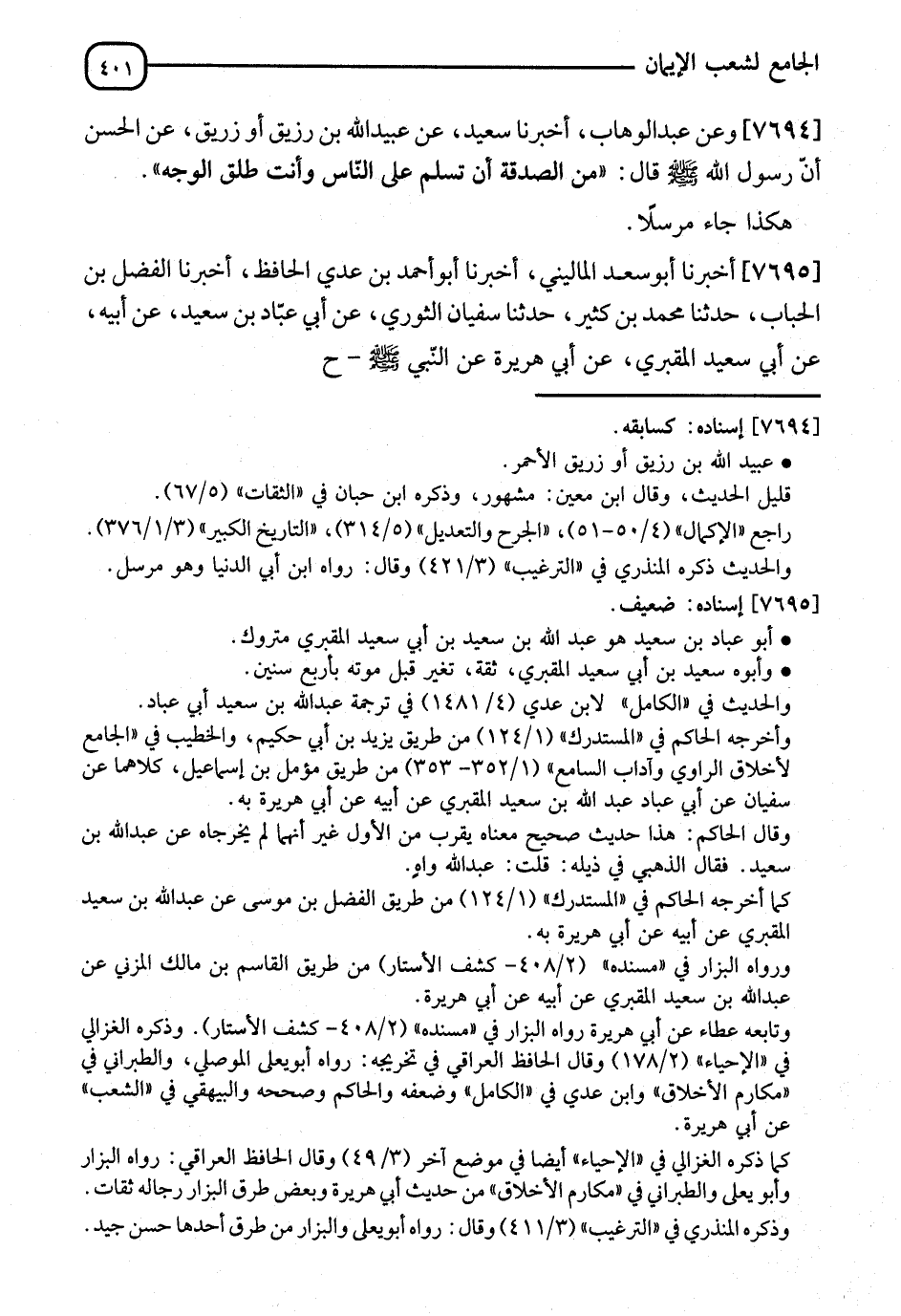 7695 - أَخْبَرَنَا أَبُو سَعْدٍ الْمَالِينِيُّ، أنا أَبُو أَحْمَدَ بْنُ عَدِيٍّ الْحَافِظُ، أنا الْفَضْلُ بْنُ الْحُبَابِ، نا مُحَمَّدُ بْنُ كَثِيرٍ، نا سُفْيَانُ الثَّوْرِيُّ، عَنْ أَبِي عَبَّادِ بْنِ سَعِيدٍ، عَنْ أَبِيهِ، عَنْ أَبِي سَعِيدٍ الْمَقْبُرِيِّ، عَنْ أَبِي هُرَيْرَةَ، عَنِ النَّبِيِّ صَلَّى اللَّهُ عَلَيْهِ وَسَلَّمَ، -[402]- وَأَخْبَرَنَا أَبُو الْحُسَيْنِ عَلِيُّ بْنُ أَحْمَدَ بْنِ عَبْدَانَ، أنا سُلَيْمَانُ بْنُ أَحْمَدَ الطَّبَرَانِيُّ، نا مُعَاذُ بْنُ الْمُثَنَّى، وَمُحَمَّدُ بْنُ مُحَمَّدٍ التَّمَّارُ، قَالَا: نا ابْنُ كَثِيرٍ، نا سُفْيَانُ، عَنْ أَبِي عَبَّادٍ، عَنْ سَعِيدٍ الْمَقْبُرِيِّ، عَنْ أَبِي هُرَيْرَةَ، عَنِ النَّبِيِّ صَلَّى اللَّهُ عَلَيْهِ وَسَلَّمَ، قَالَ: " §إِنَّكُمْ لَا تَسَعُونَ النَّاسَ بِأَمْوَالِكُمْ، وَلَكِنْ يَسَعُهُمْ مِنْكُمْ بَسْطُ الْوَجْهِ، وَحُسْنُ الْخُلُقِ " تَفَرَّدَ بِهِ أَبُو عَبَّادٍ عَبْدُ اللهِ بْنُ سَعِيدٍ، عَنْ أَبِيهِ، وَرُوِيَ عَنْ عَبْدِ اللهِ بْنِ إِدْرِيسَ الْأَوْدِيِّ، عَنْ أَبِيهِ، عَنْ جَدِّهِ، عَنْ أَبِي هُرَيْرَةَ، عَنِ النَّبِيِّ صَلَّى اللَّهُ عَلَيْهِ وَسَلَّمَ، وَرُوِيَ مِنْ وَجْهٍ آخَرَ ضَعِيفٍ، عَنْ هِشَامِ بْنِ عُرْوَةَ، عَنْ أَبِيهِ، عَنْ عَائِشَةَ مَرْفُوعًا،