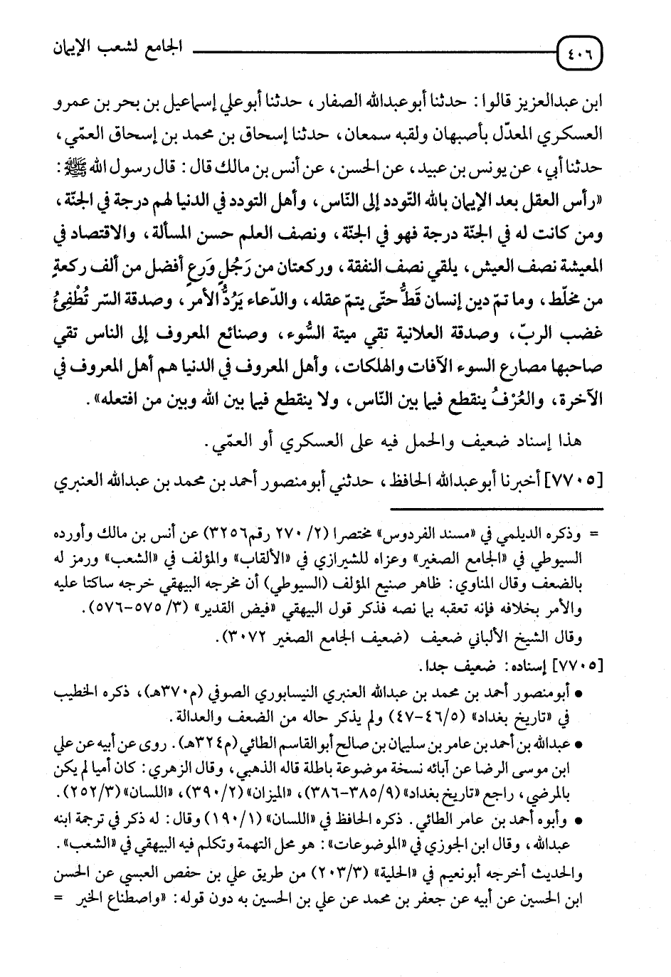 7705 - أَخْبَرَنَا أَبُو عَبْدِ اللهِ الْحَافِظُ، حَدَّثَنِي أَبُو مَنْصُورٍ أَحْمَدُ بْنُ مُحَمَّدِ بْنِ عَبْدِ اللهِ الْعَنْبَرِيُّ -[407]- الصُّوفِيُّ النَّيْسَابُورِيُّ نَزِيلُ بَغْدَادَ، نا عَبْدُ اللهِ بْنُ أَحْمَدَ بْنِ عَامِرٍ، نا أَبِي، نا عَلِيُّ بْنُ مُوسَى الرِّضَا، نا مُوسَى بْنُ جَعْفَرٍ الْمُرْتَضَى، حَدَّثَنِي أَبِي جَعْفَرُ بْنُ مُحَمَّدٍ، نا أَبِي، عَنْ أَبِيهِ عَلِيِّ بْنِ الْحُسَيْنِ، عَنْ أَبِيهِ، عَنْ عَلِيٍّ، قَالَ: قَالَ رَسُولُ اللهِ صَلَّى اللَّهُ عَلَيْهِ وَسَلَّمَ: " §رَأْسُ الْعَقْلِ بَعْدَ الدِّينِ التَّوَدُّدُ إِلَى النَّاسِ، واصْطِنَاعُ الْخَيْرِ إِلَى كُلِّ بَرٍّ وَفَاجِرٍ " وَرُوِّينَا فِي التَّوَدُّدِ إِلَى النَّاسِ عَنْ عَلِيِّ بْنِ يَزِيدَ، عَنِ ابْنِ الْمُسَيِّبِ، عَنِ النَّبِيِّ صَلَّى اللَّهُ عَلَيْهِ وَسَلَّمَ مُرْسَلًا وَرُوِّينَاهُ عَنْ أَبِي الْجُوَيْرِيَةِ، عَنِ ابْنِ عَبَّاسٍ، عَنِ النَّبِيِّ صَلَّى اللَّهُ عَلَيْهِ وَسَلَّمَ