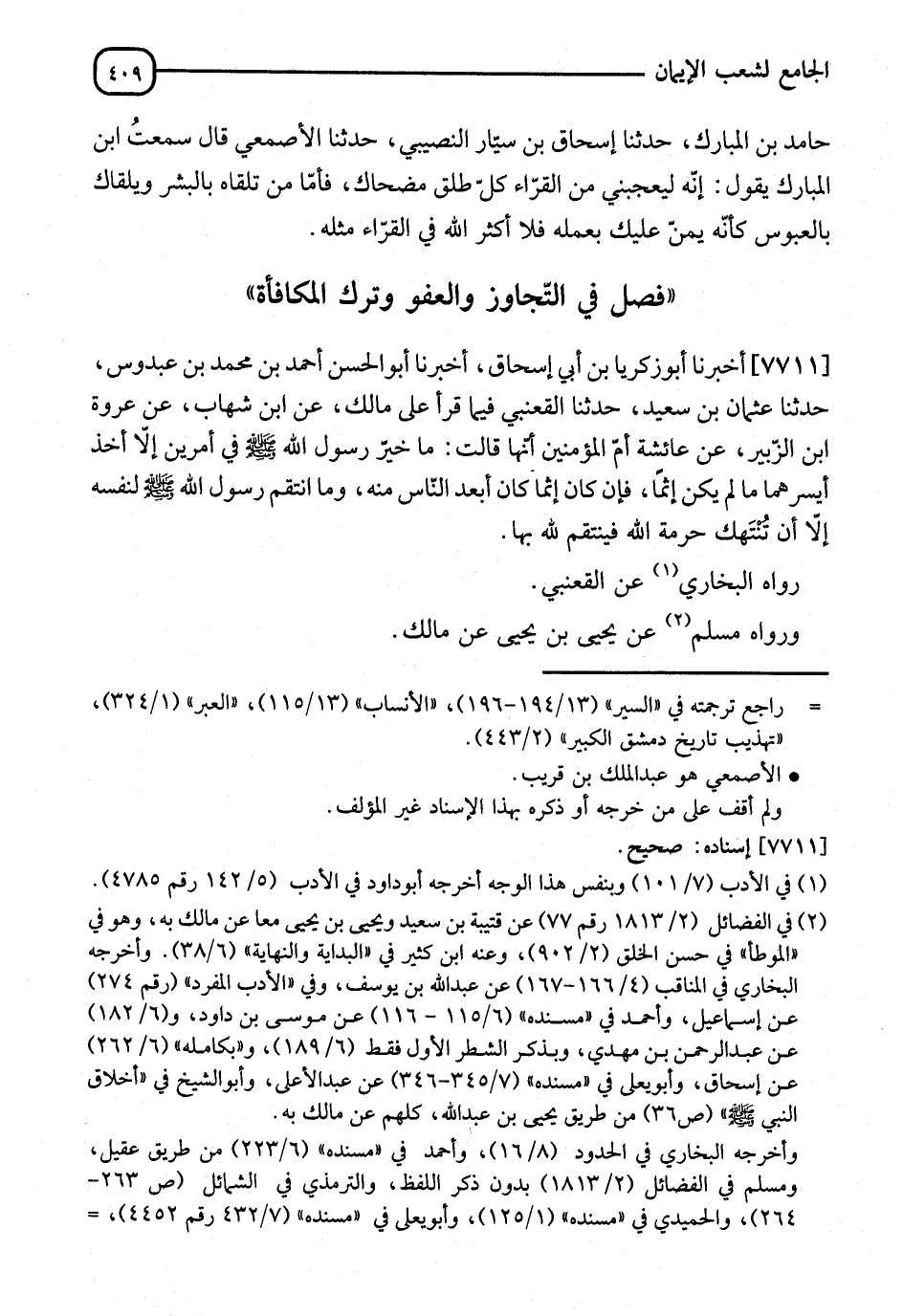 7711 - أَخْبَرَنَا أَبُو زَكَرِيَّا بْنُ أَبِي إِسْحَاقَ، أنا أَبُو الْحَسَنِ أَحْمَدُ بْنُ مُحَمَّدِ بْنِ عُبْدُوسٍ، نا عُثْمَانُ بْنُ سَعِيدٍ، نا الْقَعْنَبِيُّ، فِيمَا قَرَأَ عَلَى مَالِكٍ، عَنِ ابْنِ شِهَابٍ، عَنْ عُرْوَةَ بْنِ الزُّبَيْرِ، عَنْ عَائِشَةَ أُمِّ الْمُؤْمِنِينَ، أَنَّهَا قَالَتْ: §" مَا خُيِّرَ رَسُولُ اللهِ صَلَّى اللَّهُ عَلَيْهِ وَسَلَّمَ بَيْنَ أَمْرَيْنِ إِلَّا أَخَذَ بِأَيْسَرِهِمَا مَا لَمْ يَكُنْ إِثْمًا، فَإِنْ كَانَ إِثْمًا كَانَ أَبَعْدَ النَّاسِ مِنْهُ، وَمَا انْتَقَمَ رَسُولُ اللهِ صَلَّى اللَّهُ عَلَيْهِ وَسَلَّمَ لِنَفْسِهِ إِلَّا أَنْ تُنْتَهَكَ حُرْمَةُ اللهِ فَيَنْتَقِمُ اللهُ بِهَا " رَوَاهُ الْبُخَارِيُّ، عَنِ الْقَعْنَبِيِّ، وَرَوَاهُ مُسْلِمٌ، عَنْ يَحْيَى بْنِ يَحْيَى، عَنْ مَالِكٍ