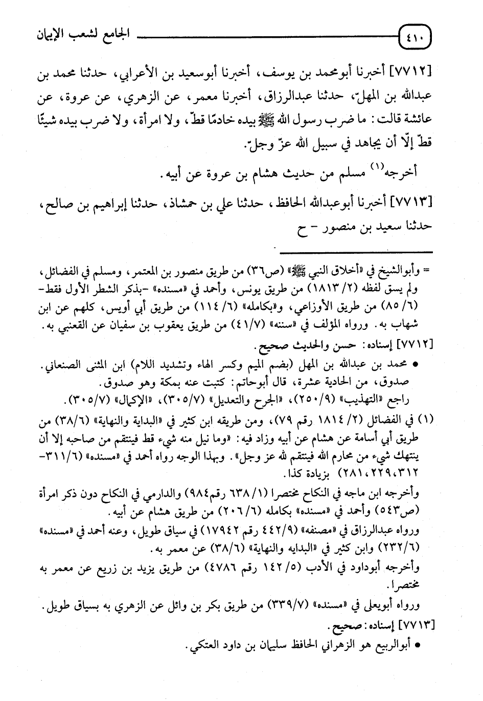 7712 - أَخْبَرَنَا أَبُو مُحَمَّدِ بْنُ يُوسُفَ، أنا أَبُو سَعِيدِ بْنُ الْأَعْرَابِيِّ، نا مُحَمَّدُ بْنُ عَبْدِ اللهِ بْنِ الْمُهَاجِرِ، نا عَبْدُ الرَّزَّاقِ، أنا مَعْمَرٌ، عَنِ الزُّهْرِيِّ، عَنْ عُرْوَةَ، عَنْ عَائِشَةَ، قَالَتْ: §" مَا ضَرَبَ رَسُولُ اللهِ صَلَّى اللَّهُ عَلَيْهِ وَسَلَّمَ بِيَدِهِ خَادِمًا قَطُّ، وَلَا امْرَأَةً، وَلَا ضَرَبَ بِيَدِهِ شَيْئًا إِلَّا أَنْ يُجَاهِدَ فِي سَبِيلِ اللهِ عَزَّ وَجَلَّ " أَخْرَجَهُ مُسْلِمٌ، مِنْ حَدِيثِ هِشَامِ بْنِ عُرْوَةَ، عَنْ أَبِيهِ
