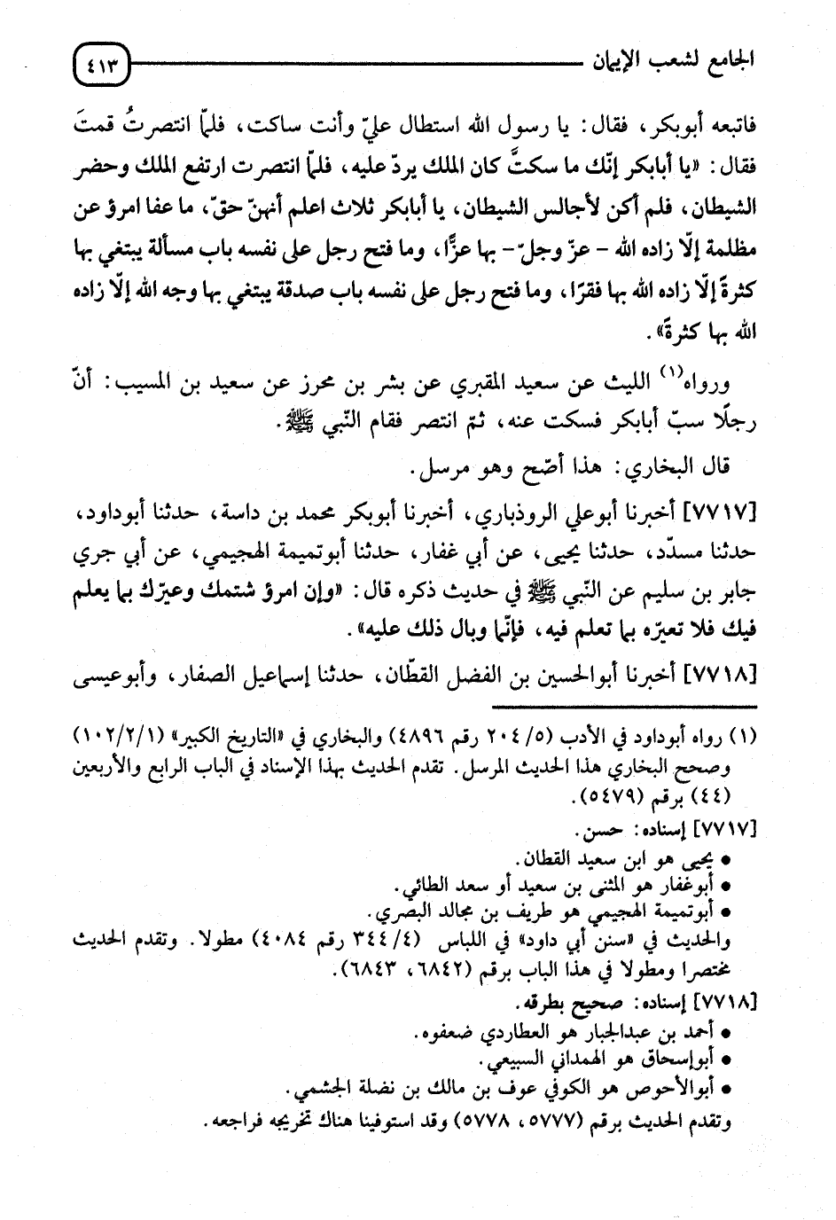 7717 - أَخْبَرَنَا أَبُو عَلِيٍّ الرُّوذْبَارِيُّ، أنا أَبُو بَكْرٍ مُحَمَّدُ بْنُ بَكْرٍ، نا أَبُو دَاوُدَ، نا مُسَدَّدٌ، نا يَحْيَى، عَنِ أَبِي غِفَارٍ، نا أَبُو تَمِيمَةَ الْهُجَيْمِيُّ، عَنْ أَبِي جُرَيٍّ جَابِرِ بْنِ سُلَيْمٍ، عَنِ النَّبِيِّ صَلَّى اللَّهُ عَلَيْهِ وَسَلَّمَ فِي حَدِيثٍ ذَكَرَهُ، قَالَ: " §وَإِنِ امْرُؤٌ شَتَمَكَ وَعَيَّرَكَ بِمَا يَعْلَمُ فِيكَ، فَلَا تُعَيِّرْهُ بِمَا تَعْلَمُ فِيهِ، فَإِنَّمَا وَبَالُ ذَلِكَ عَلَيْهِ "