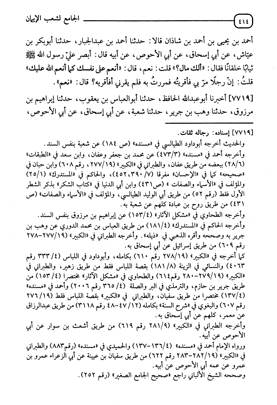 7719 - أَخْبَرَنَا أَبُو عَبْدِ اللهِ الْحَافِظُ، نا أَبُو الْعَبَّاسِ بْنُ يَعْقُوبَ، نا إِبْرَاهِيمُ بْنُ مَرْزُوقٍ، نا وَهْبُ بْنُ جَرِيرٍ، نا شُعْبَةُ، عَنْ أَبِي إِسْحَاقَ، عَنْ أَبِي الْأَحْوَصِ، -[415]- عَنْ أَبِيهِ، قَالَ: أَتَيْتُ رَسُولَ اللهِ صَلَّى اللَّهُ عَلَيْهِ وَسَلَّمَ وَأَنَا قَشِفٌ، قَالَ: " فَهَلْ لَكَ مَالٌ؟ " قُلْتُ: نَعَمْ، قَالَ: " مِنْ أَيِّ الْمَالِ؟ " قُلْتُ: مِنْ كُلِّ الْمَالِ: مِنَ الْإِبِلِ وَالْخَيْلِ وَالْغَنَمِ وَالرَّقِيقِ، قَالَ: " §فَإِذَا آتَاكَ اللهُ مَالًا فَلْيُرَ عَلَيْكَ "، ثُمَّ قَالَ: " هَلْ تُنْتِجُ إِبِلُ أَهْلِكَ صِحَاحًا آذَانُهَا، فَتَعْمِدُ إِلَى الْمُوسَى فَتَقْطَعُ آذَانَهَا، فَتَقُولُ: هَذِهِ بُحُرٌ، وَتَشُقُّهَا أَوْ تَشُقُّ جُلُودَهَا، فَتَقُولُ: هَذِهِ صُرُمٌ، فَتُحَرِّمُهَا عَلَيْكَ؟ " قَالَ: نَعَمْ، قَالَ: " فَإِنَّ مَا آتَاكَ اللهُ حِلٌّ، وَسَاعِدُ اللهِ أَشَدُّ مِنْ سَاعِدِكَ، وَمُوسَى اللهِ أَحَدُّ مِنْ مُوسَاكَ " قُلْتُ: يَا رَسُولَ اللهِ، رَجُلٌ نَزَلْتُ بِهِ فَلَمْ يَقْرِنِي وَلَمْ يُكْرِمْنِي، ثُمَّ نَزَّلَ بِي أُجَازِيهِ بِمَا صَنَعَ أَمْ أَقْرِيهِ؟ قَالَ: " بَلْ أَقْرِهِ "
