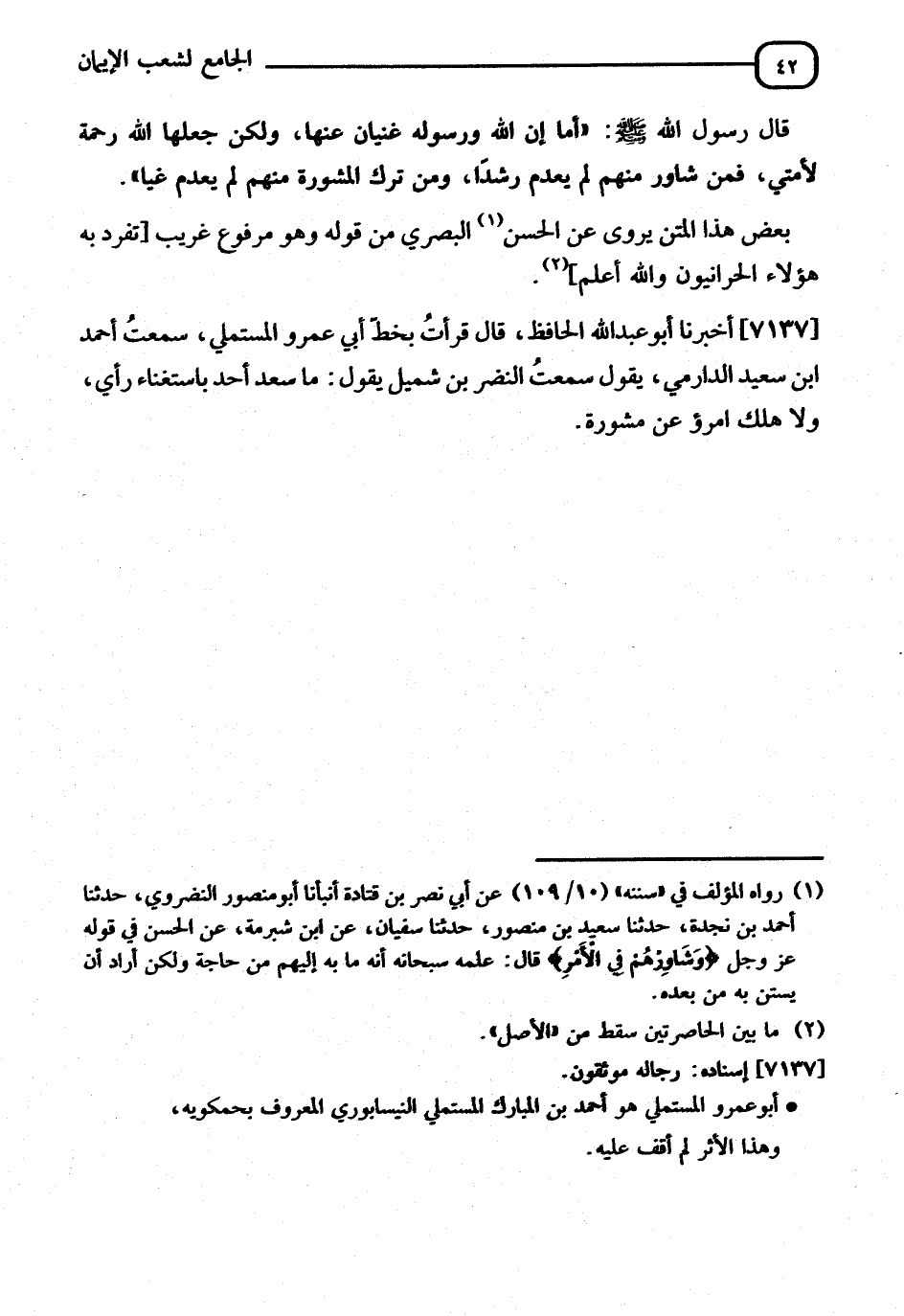 7137 - أَخْبَرَنَا أَبُو عَبْدِ اللهِ الْحَافِظُ، قَالَ: قَرَأْتُ بِخَطِّ أَبِي عَمْرٍو الْمُسْتَمْلِي، سَمِعْتُ أَحْمَدَ بْنَ سَعِيدٍ الدَّارِمِيَّ، سَمِعْتُ النَّضْرَ بْنَ شُمَيْلٍ يَقُولُ: " §مَا سَعِدَ أَحَدٌ بِاسْتِغْنَاءِ رَأْيٍ، وَلَا هَلَكَ امْرُؤٌ دَعَا مَشُورَةً "