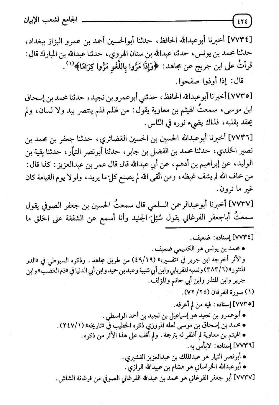 7734 - أَخْبَرَنَا أَبُو عَبْدِ اللهِ الْحَافِظُ، نا أَبُو الْحُسَيْنِ أَحْمَدُ بْنُ عَمْرٍو الرَّزَّازُ بِبَغْدَادَ، نا مُحَمَّدُ بْنُ يُونُسَ، نا عَبْدُ اللهِ بْنُ سِنَانٍ الْهَرَوِيُّ، نا عَبْدُ اللهِ بْنُ الْمُبَارَكِ، قَالَ: قَرَأْتُ عَلَى ابْنِ جُرَيْجٍ، عَنْ مُجَاهِدٍ: {§وَإِذَا مَرُّوا بِاللَّغْوِ مَرُّوا كِرَامًا} [الفرقان: 72]، قَالَ: " إِذَا أُوذُوا صَفَحُوا "
