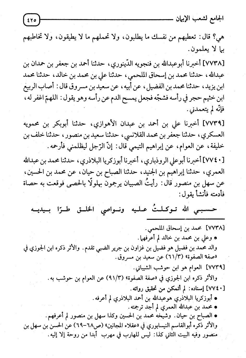7739 - أَخْبَرَنَا عَلِيُّ بْنُ أَحْمَدَ بْنِ عَبْدَانَ الْأَهْوَازِيُّ، نا أَبُو بَكْرِ بْنُ مَحْمَوَيْهِ الْعَسْكَرِيُّ، نا جَعْفَرُ بْنُ مُحَمَّدٍ الْقَلَانِسِيُّ، نا سَعِيدُ بْنُ مَنْصُورٍ، نا خَلَفُ بْنُ خَلِيفَةَ، عَنِ الْعَوَّامِ، عَنْ إِبْرَاهِيمَ التَّيْمِيِّ، قَالَ: " إِنَّ §الرَّجُلَ لَيَظْلِمُنِي فَأَرْحَمَهُ "