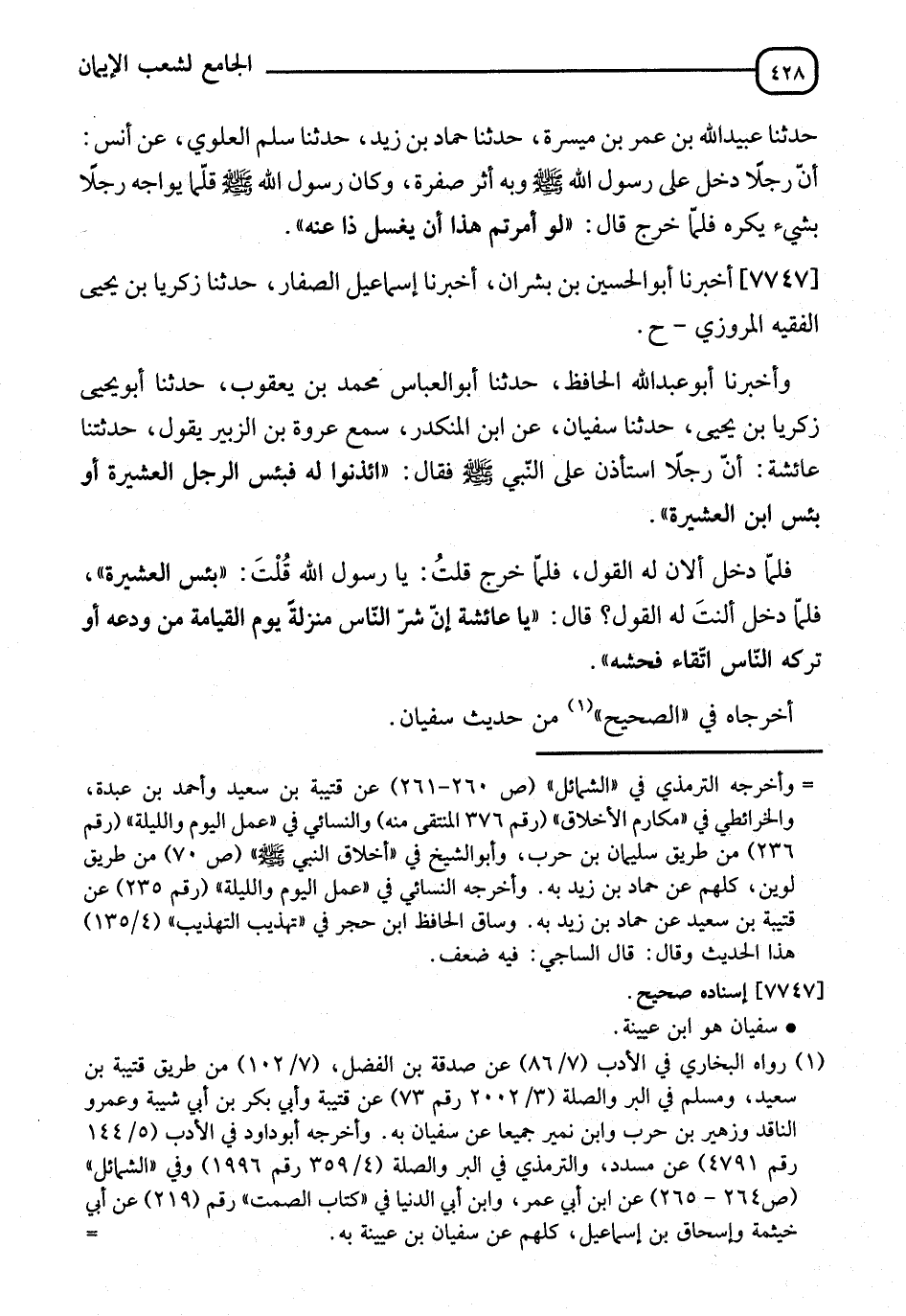 7747 - أَخْبَرَنَا أَبُو الْحُسَيْنِ بْنُ بِشْرانَ، أنا إِسْمَاعِيلُ الصَّفَّارُ، نا زَكَرِيَّا بْنُ يَحْيَى الْفَقِيهُ الْمَرْوَزِيُّ، ح وَأَخْبَرَنَا أَبُو عَبْدِ اللهِ الْحَافِظُ، نا أَبُو الْعَبَّاسِ مُحَمَّدُ بْنُ يَعْقُوبَ، نا أَبُو يَحْيَى زَكَرِيَّا بْنُ يَحْيَى، نا سُفْيَانُ، عَنِ ابْنِ الْمُنْكَدِرِ، سَمِعَ عُرْوَةَ بْنَ الزُّبَيْرِ، يَقُولُ: حَدَّثَتْنَا عَائِشَةُ، أَنَّ رَجُلًا اسْتَأْذَنَ عَلَى النَّبِيِّ صَلَّى اللَّهُ عَلَيْهِ وَسَلَّمَ، فَقَالَ: " ائْذَنُوا لَهُ، فَبِئْسَ رَجُلُ الْعُشَيْرَةِ، أَوْ بِئْسَ ابْنُ الْعُشَيْرَةِ "، فَلَمَّا دَخَلَ أَلَانَ لَهُ الْقَوْلَ، فَلَمَّا خَرَجَ قُلْتُ: يَا رَسُولَ اللهِ، قُلْتَ: " بِئْسَ ابْنُ الْعُشَيْرَةِ "، فَلَمَّا دَخَلَ أَلَنْتَ لَهُ الْقَوْلَ؟، قَالَ: " يَا عَائِشَةُ، إِنَّ §شَرَّ النَّاسِ مَنْزِلَةً يَوْمَ الْقِيَامَةِ مَنْ وَدَعَهُ النَّاسُ - أَوْ تَرَكَهُ - اتِّقَاءَ فُحْشِهِ " أَخْرَجَاهُ فِي الصَّحِيحِ، مِنْ حَدِيثِ سُفْيَانَ